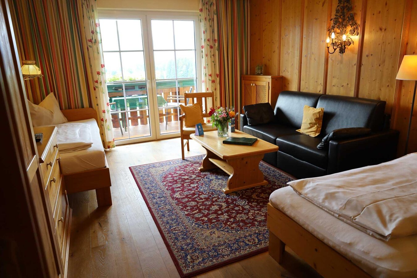 Unsere komplett eingerichteten und komfortablen Ferienwohnungen für 2-5 Personen bieten Ihnen einladende Schlafzimmer, moderne Badezimmer mit separatem WC, einen großen Wohnschlafraum mit Balkon und wunderschönem Panoramablick auf die umliegende Berglandschaft. In der voll ausgestatteten Küche mit gemütlicher Sitzecke genießen Sie gesellige Urlaubstage mit Freunden und Familie. Jede Ferienwohnung ist auch mit unserem köstlichen Frühstück oder Halbpension buchbar.