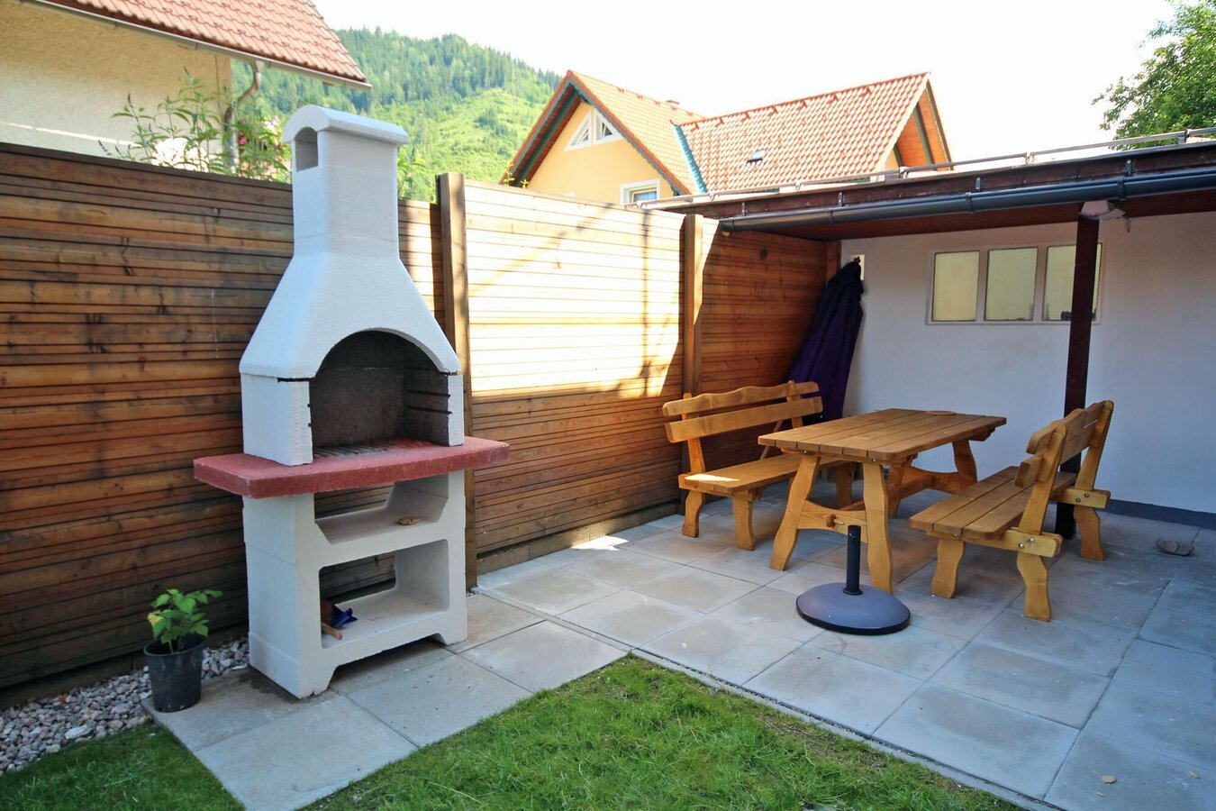 Das Erdgeschoss verfügt über einen großzügigen Wohnraum mit Wohnlandschaft und einer komplett ausgestatteten Küche mit Essecke. Vom Wohnraum aus gelangen Sie auf die 30m² Sonnenterasse mit Garten, wo Sie gemütliche Stunden und einen herrlichen Ausblick genießen können. Weiteres bietet das Erdgeschoss ein separates Schlafzimmer mit Doppelbett, ein separates Badezimmer mit Dusche und WC sowie einen großzügigen Vorraum.