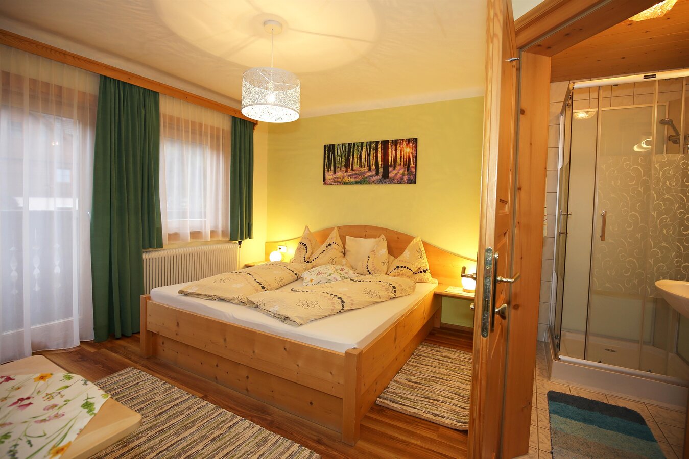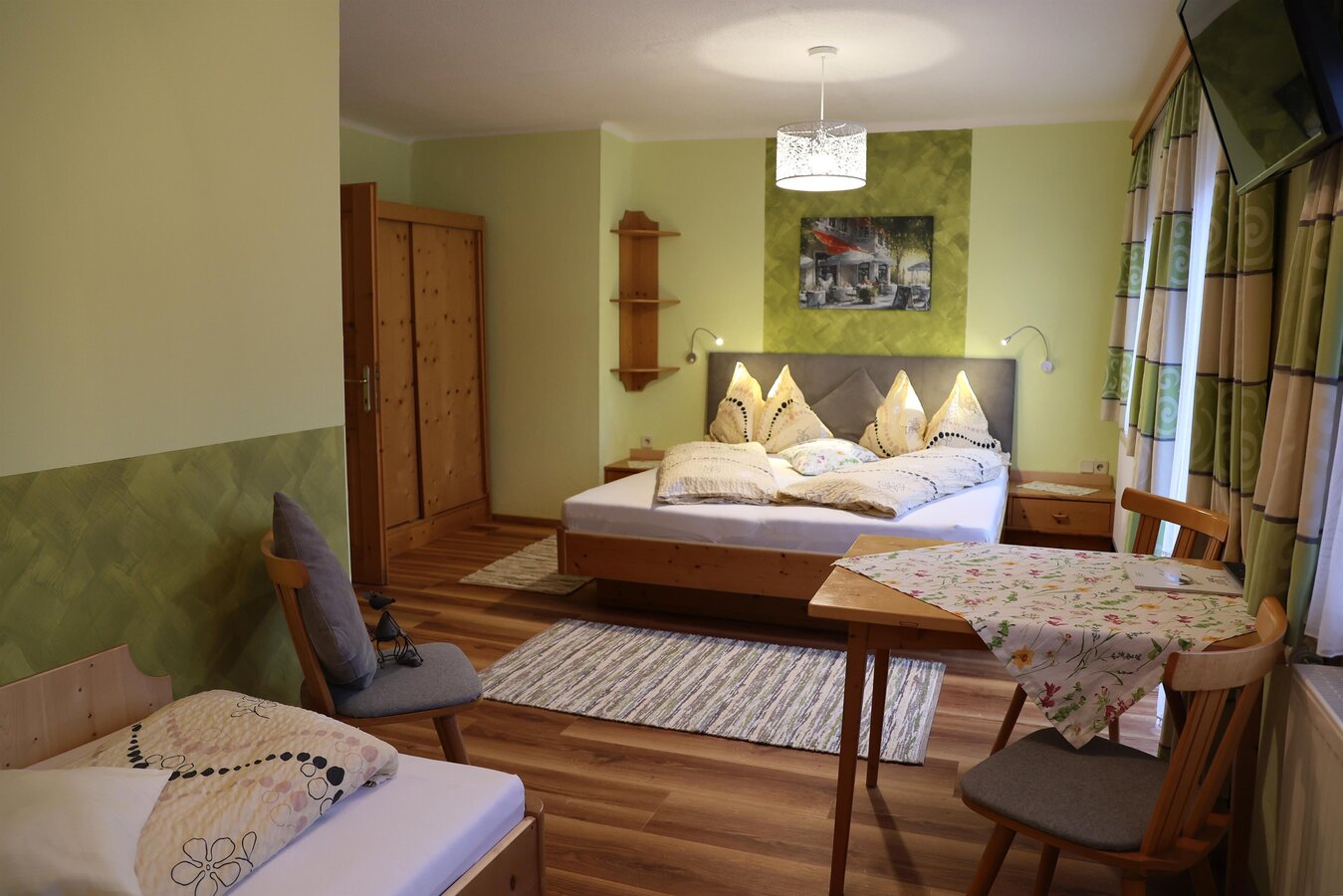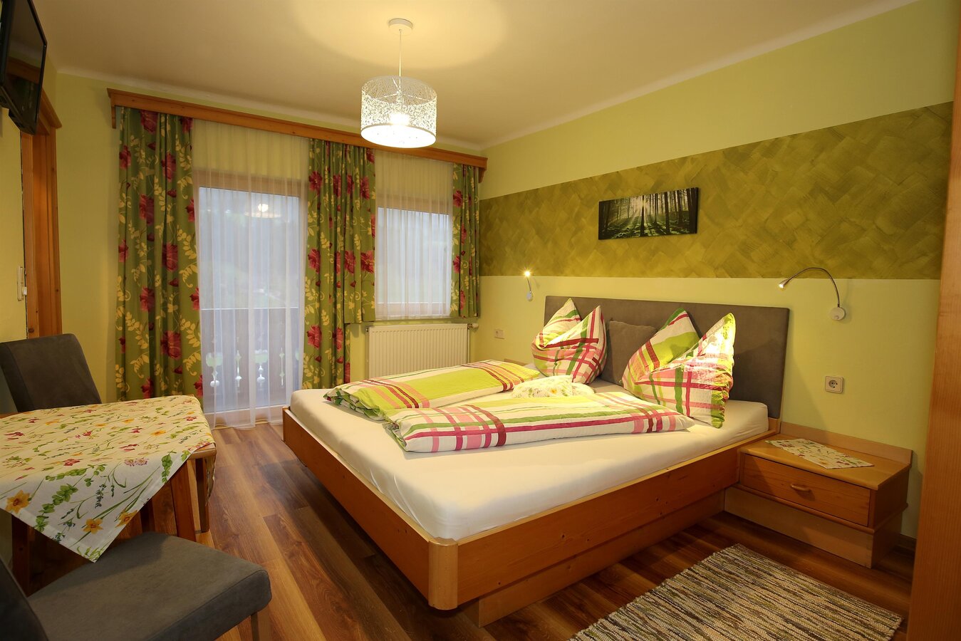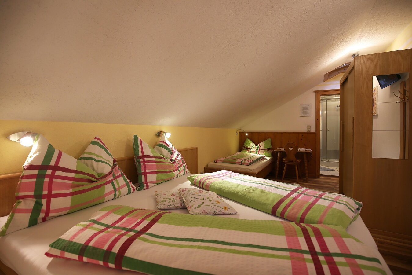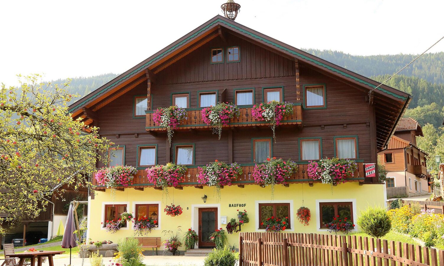 Der Haufhof bietet insgesamt für bis zu 10 Gästen Platz. Es erwarten Sie Doppel- und Dreibettzimmer. Die Nichtraucherzimmer sind allesamt mit Dusche, WC, Sat-TV und gratis W-Lan sowie teilweise Balkon ausgestattet. Von den Zimmern erwartet Sie ein atemberaubender Blick auf die heimische Bergwelt oder in unseren liebevoll gepflegten Garten. Als besonderes Service steht pro Zimmer ein überdachter Carport-Parkplatz zur Verfügung. Am Morgen erwartet Sie ein herzhaftes und ausgiebiges Frühstück vom Buffet, durch das Sie gut gestärkt in Ihren Urlaubstag starten.