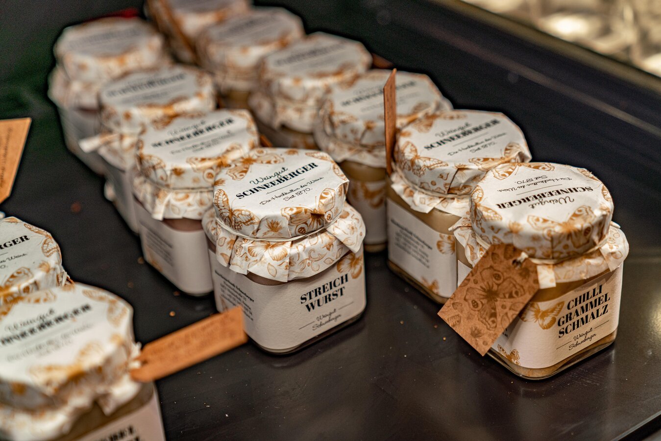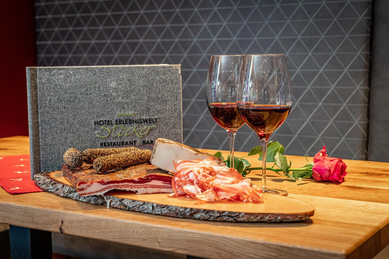 Köstlicher Speck aus dem Gailtal - das " Tal des Specks" - , Steirisches Schinkenbratl, Käse vom Moserhof (Haus/Ennstal), Chilli Grammelschmalz ergänzt durch eines erlesenes Weinsortiment.