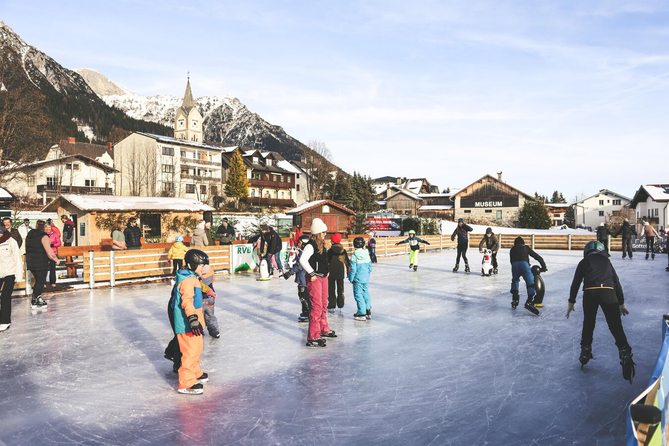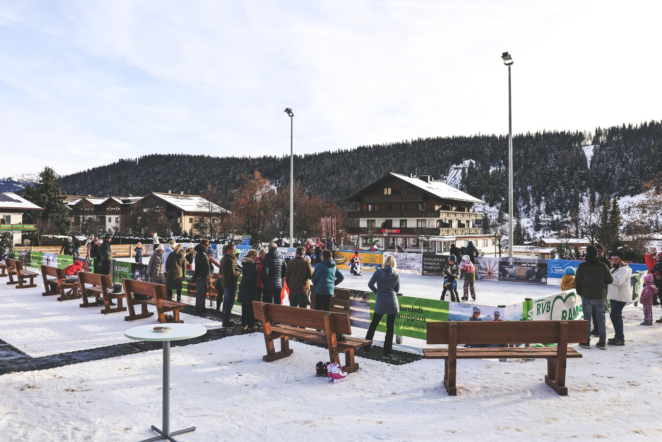 In Ramsau am Dachstein gibt es jetzt einen neuen Eislaufplatz – direkt im Ortszentrum neben der Schule. Besucher können sich vor Ort Eislaufschuhe ausleihen und ganz entspannt ihre Runden auf dem Eis drehen. Für eine kleine Stärkung zwischendurch sorgt die gemütliche Hütte mit Imbiss, in der es warme Getränke und leckere Kleinigkeiten zu essen gibt. Ein perfekter Ort für Familien, Einsteiger und alle, die den Winter in der Ramsau genießen möchten!
