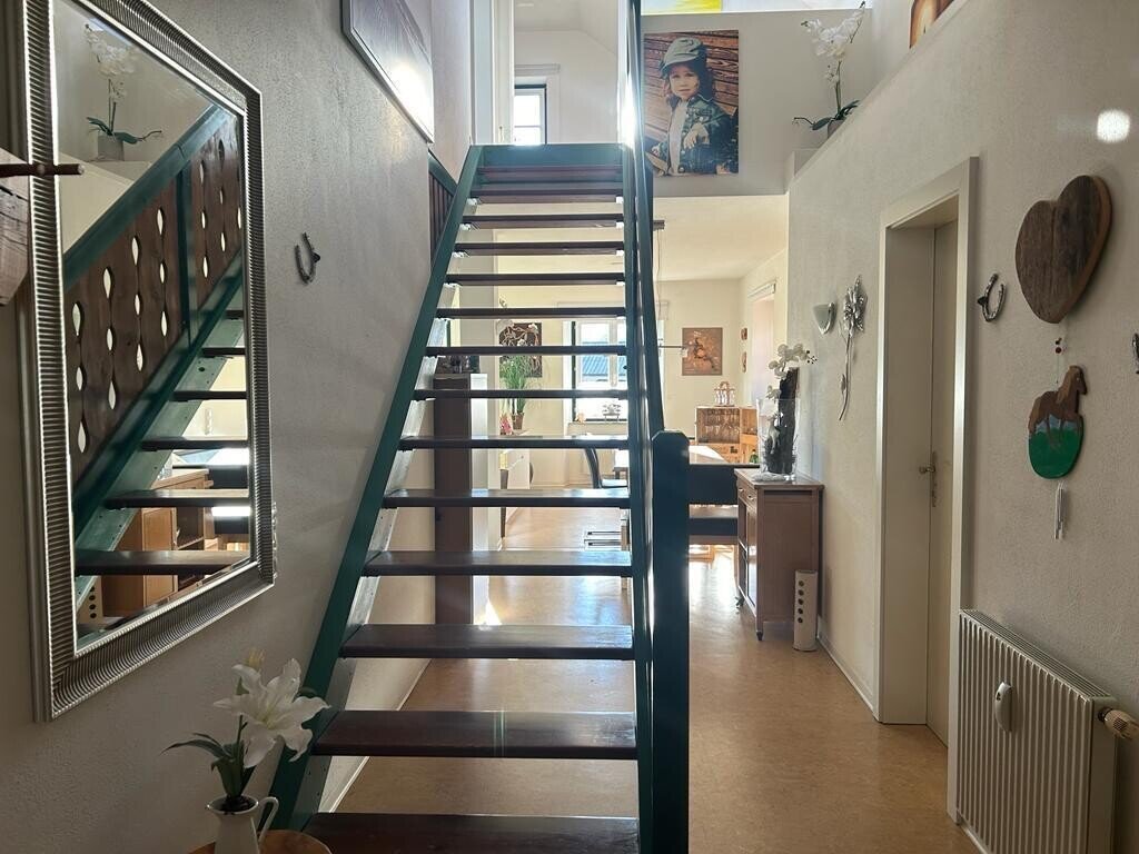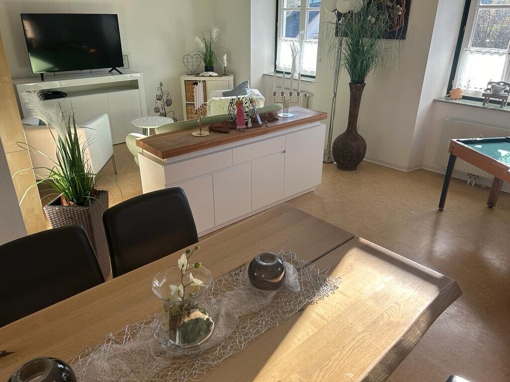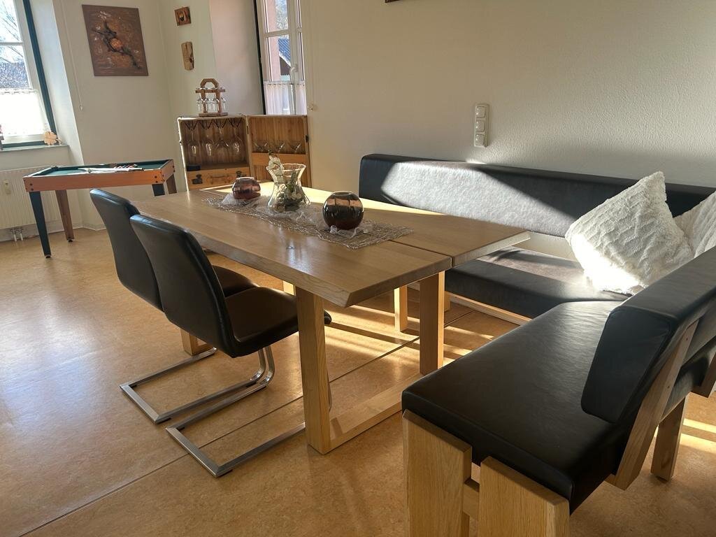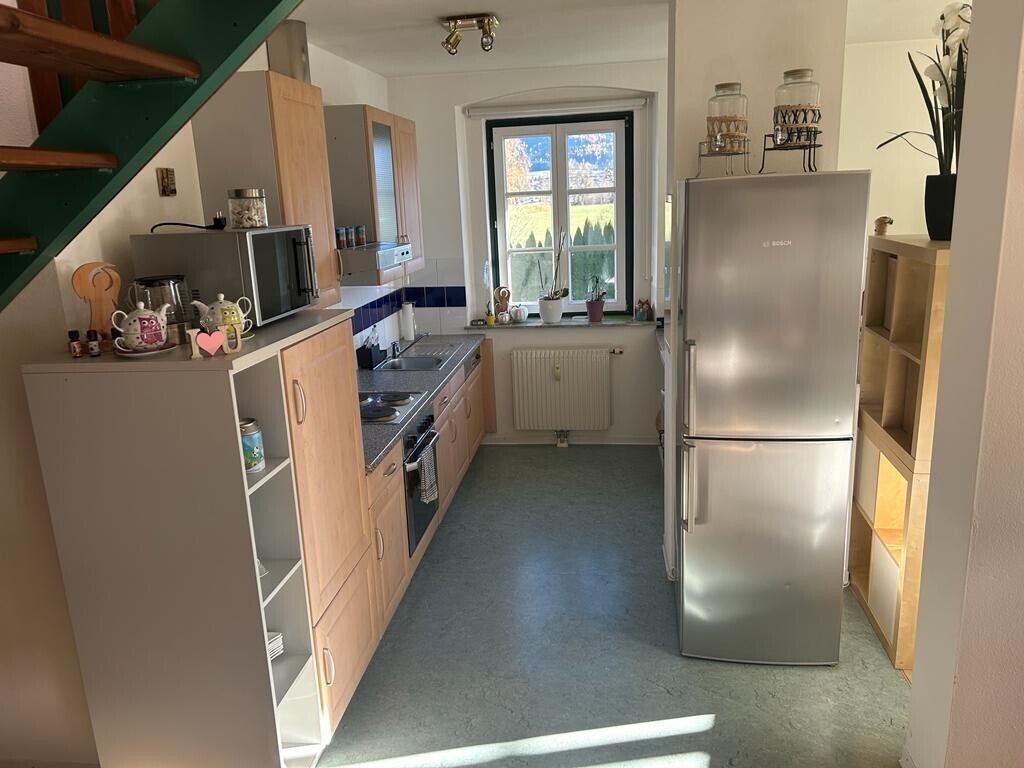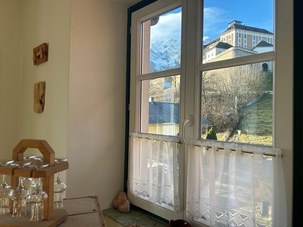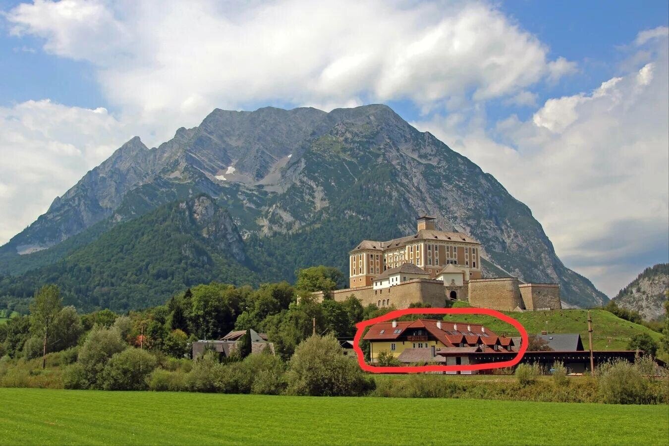 Ein Haus mit Geschichte. Die Wohnung, welche sich in einer ehemaligen Schindelfabrik befindet, besticht durch den Panoramablick auf den Grimming und Schloss Trautenfels.