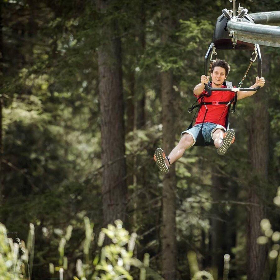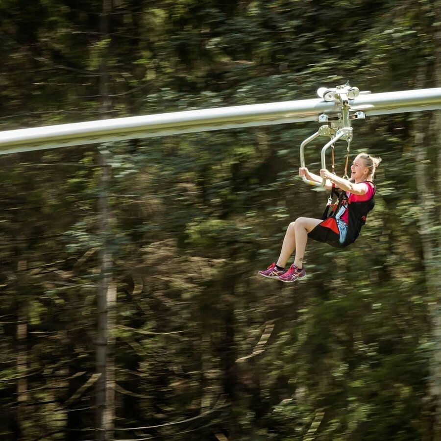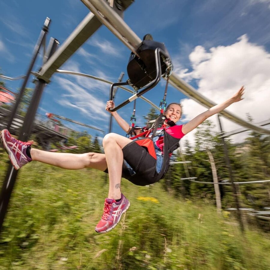 Der Flying Coaster sorgt für ein atemberaubendes Achterbahnfeeling und einen hohen Funfaktor. Von der Talstation der Zipline führt ein dünnes Rohr in einer Höhe zwischen 3 und 12 Metern den Wald hinunter und ist im Design einer Achterbahn mit Auf- und Ab-Elementen gebaut. Mit Fahrwerken sausen die Gäste sitzend knapp an Boden und Bäumen vorbei mit bis zu 40 km/h in das Tal. Die Streckenlänge beträgt rund 800 Meter, dabei wird ein Höhenunterschied von über 100 Metern überwunden. Purer Adrenalin-Kick ist bei der Fahrt mit dem Flying Coaster in Gröbming künftig garantiert.