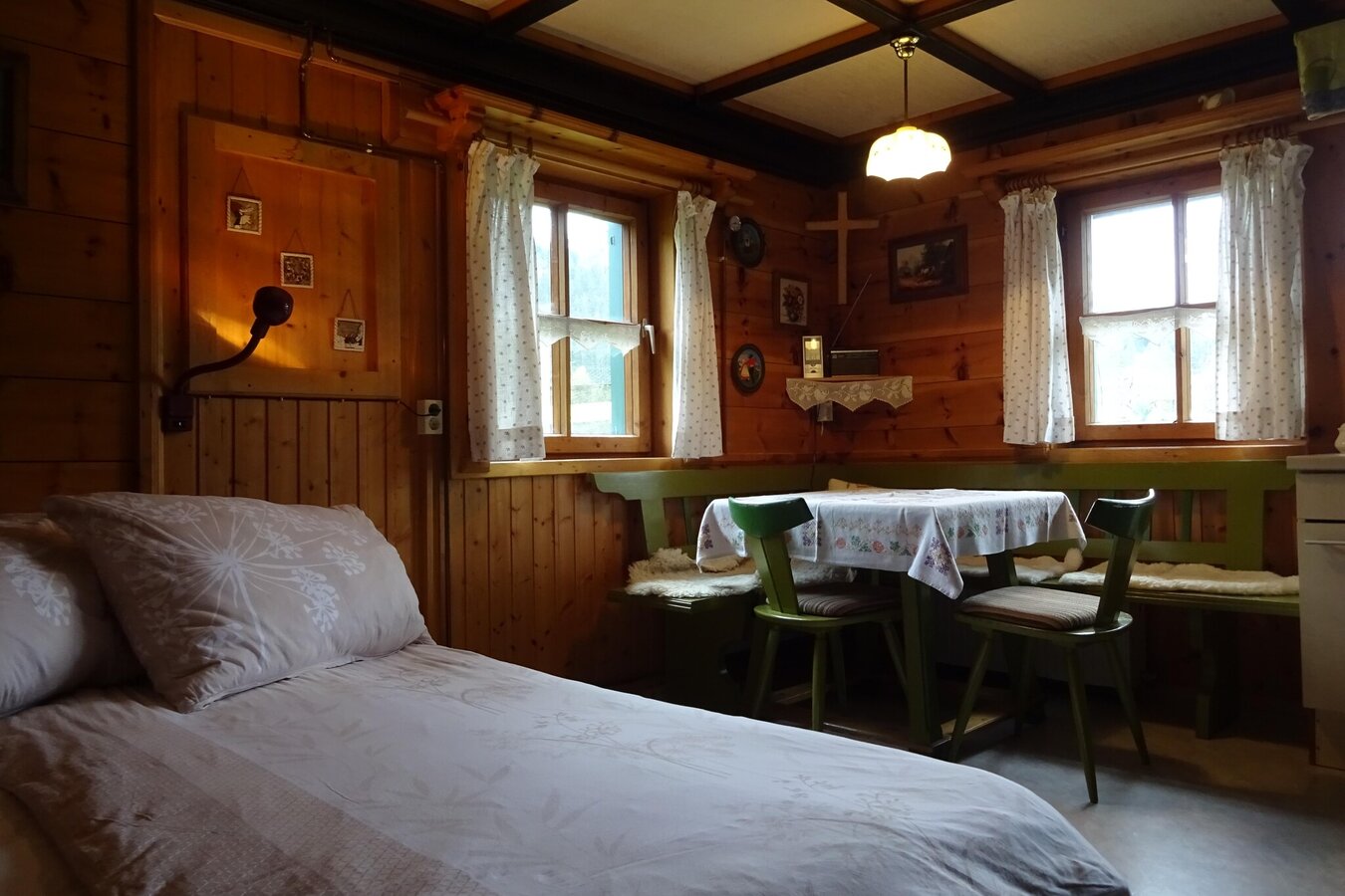 Unser Dreibettzimmer und das "Knusperhäuschen" sind gemütlich und heimelig mit viel Holz und liebevollen Details sowie mit Sat-TV und free W-Lan ausgestattet. Nach einem anstrengenden Ski – oder Wandertag finden Sie Erholung pur in der hauseigenen kleinen aber sehr gemütlichen Wohlfühloase. Gegen eine Gebühr von € 10,- können Sie die Sauna besuchen. Auf Wunsch steht Ihnen ein Bademantel für die Dauer Ihres Aufenthaltes zur Verfügung.