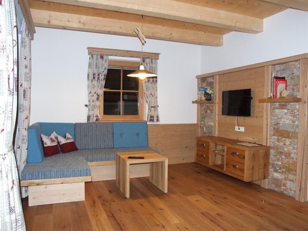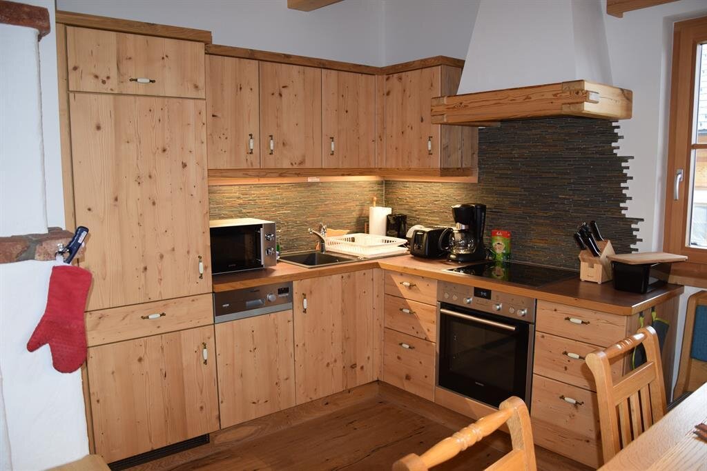Die Holzknechtzimmer sind größtenteils mit Fichtenholz ausgestattet. Zusätzlich gibt es in der Wohnstube eine Schlafcouch für eine Person. Die Küche ist komplett ausgestattet mit Kühlschrank mit Gefrierfach, E-Herd mit Backofen, Geschirrspüler, Filter-Kaffeemaschine, Frühstückstoaster, Mikrowelle, Wasserkocher, Eierkocher, Backblech, Pfannen, Töpfe, Geschirr, Besteck und Gläser.
