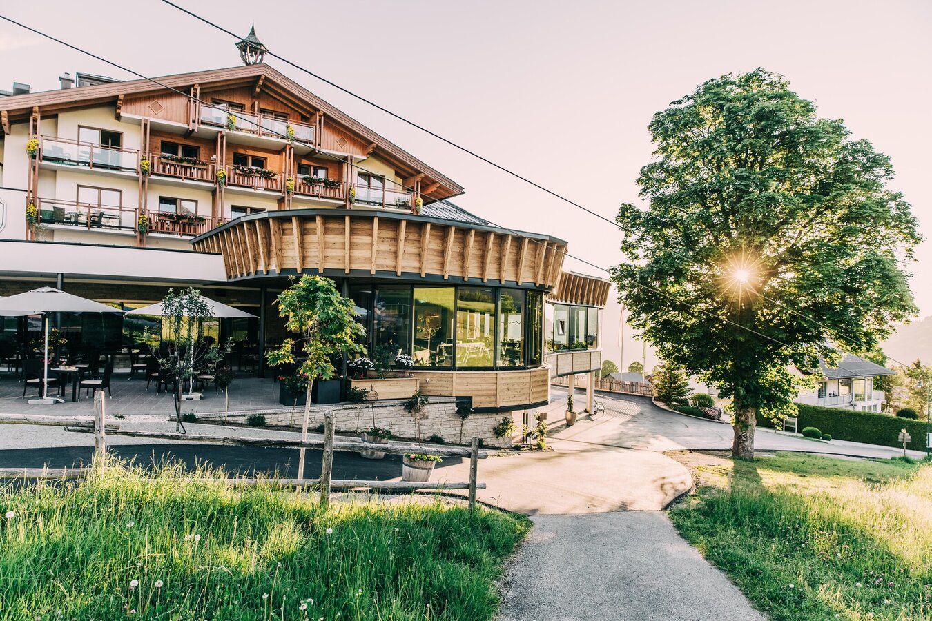 Die Terrasse lädt zum Verweilen ein und bietet einen herrlichen Blick auf die umliegende Bergkulisse, während die stilvolle Bar den Abend bei Cocktails abrundet.