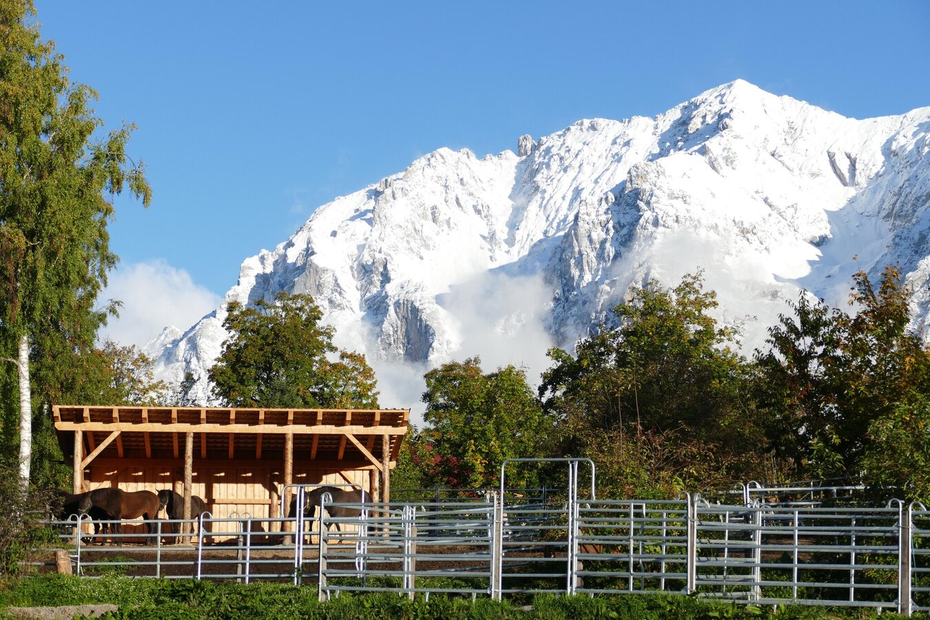 Das Gestüt befindet sich am Fuße des Dachsteins auf 1000m Seehöhe inmitten weitläufiger Weiden mit angrenzenden Gebirgswäldern und Bergpanorama; die beste Basis für eine artgerechte Haltung von Huzulen – eine trittsichere robuste Kleinpferderasse.