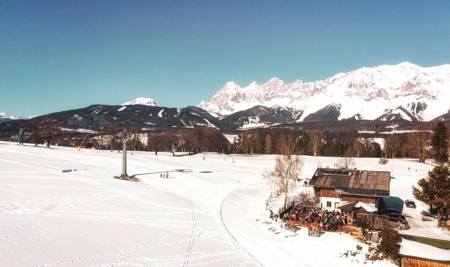 Am Fuße der Hochwurzen, dem sonnigen Rohrmooser Plateau, befindet sich das Jagastüberl. Die Piste 37 und der Sessellift Rohrmoos II führen direkt vorbei.