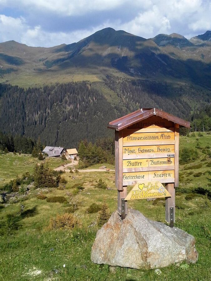 Wir verarbeiten die Milch zu Butter, Buttermilch, Topfen und zu fünf Käsesorten [Ennstaler- & Murtaler Steirerkäse, Buttermilchtopfenaufstrich, Frischkäse, Kaltenbacher-Käse]. Diese Almspezialitäten kann man mit selbst gemachtem Bauernbrot genießen oder auch mit nach Hause nehmen. Wenn man dann vom Jausnen oder von den selbstgebrannten Schnäpsen müde ist, gibt es eine Übernachtungsmöglichkeit für maximal 10 Personen. Wir haben ein großes Zimmer für 6 bis 7 Personen im „Trempl“ (Almstall), gleich neben dem Heulager und für 3 Personen in einem kleinen Zimmer über der Almsennerei.