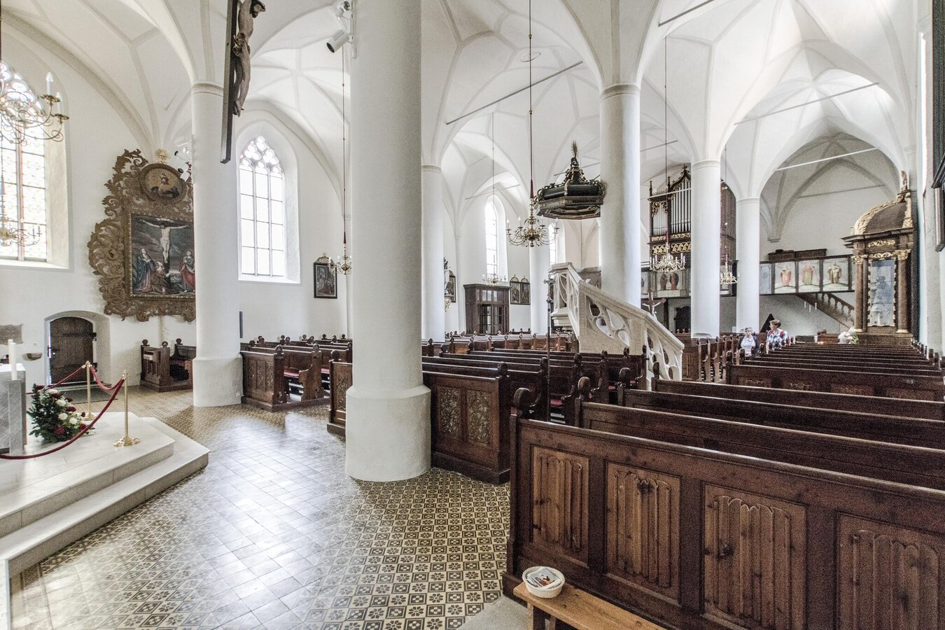 Die Kirche steht im Stadtzentrum und ist von einem Friedhof umgeben, auf dem sich nordöstlich die Annakapelle befindet.