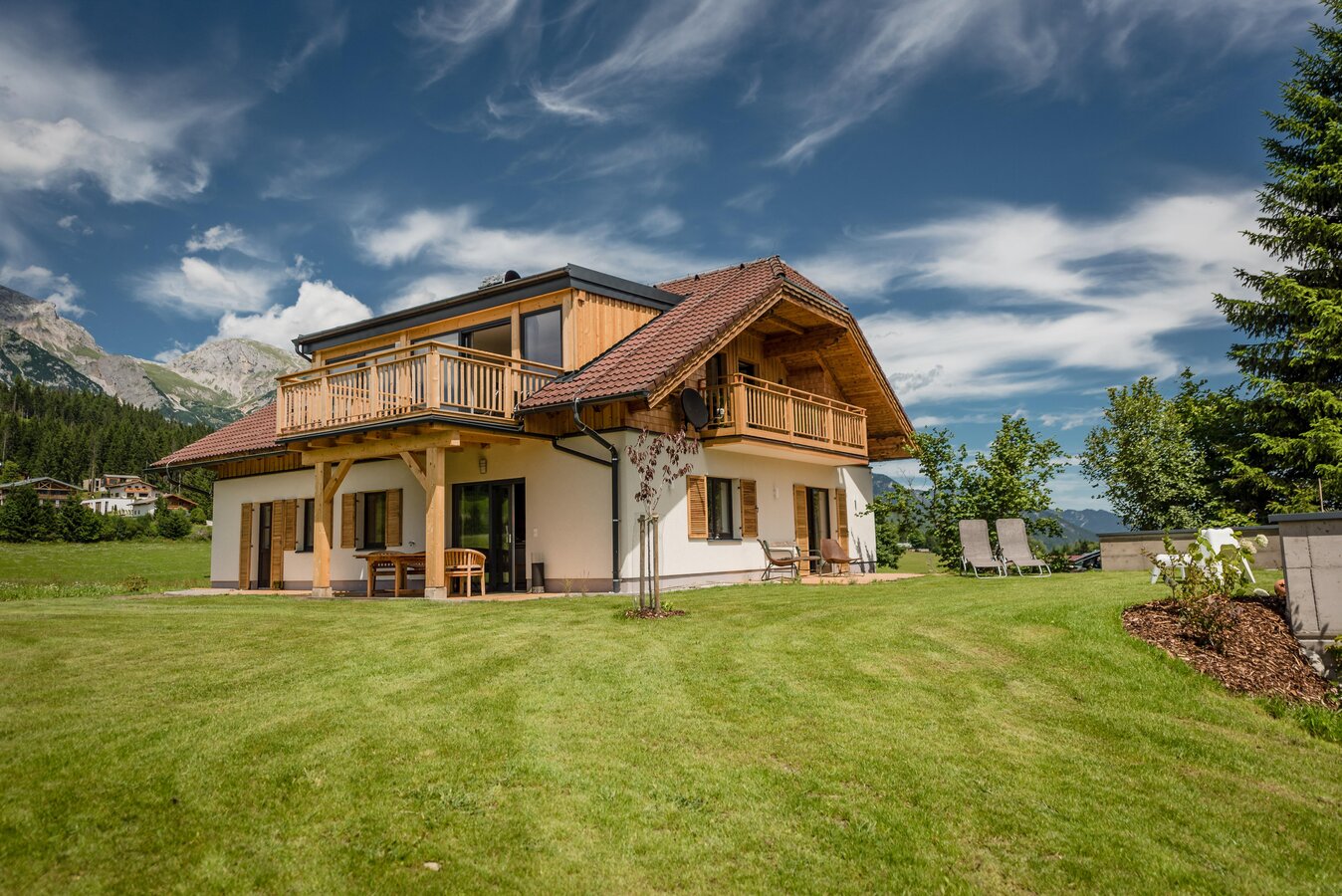Außenbereich: Großer Garten mit Terrasse/Balkon, Grillmöglichkeit und freiem Blick auf die Schladminger Tauern und das Dachsteinmassiv.