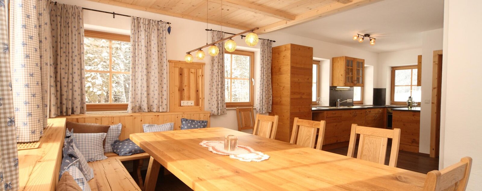 Auf einer Wohnfläche von 200 qm² befindet sich ein großer Küchen-Wohnbereich mit südseitiger Terrasse und Blick auf die Schladminger Tauern, zwei Doppelzimmer, ein 3-Bett-Zimmer und im Dachgeschoss ein Bettenlager für 3 Personen, zwei Bäder und 2 separate WC`s. Zwei Doppelzimmer verfügen über einen südseitigen Balkon.