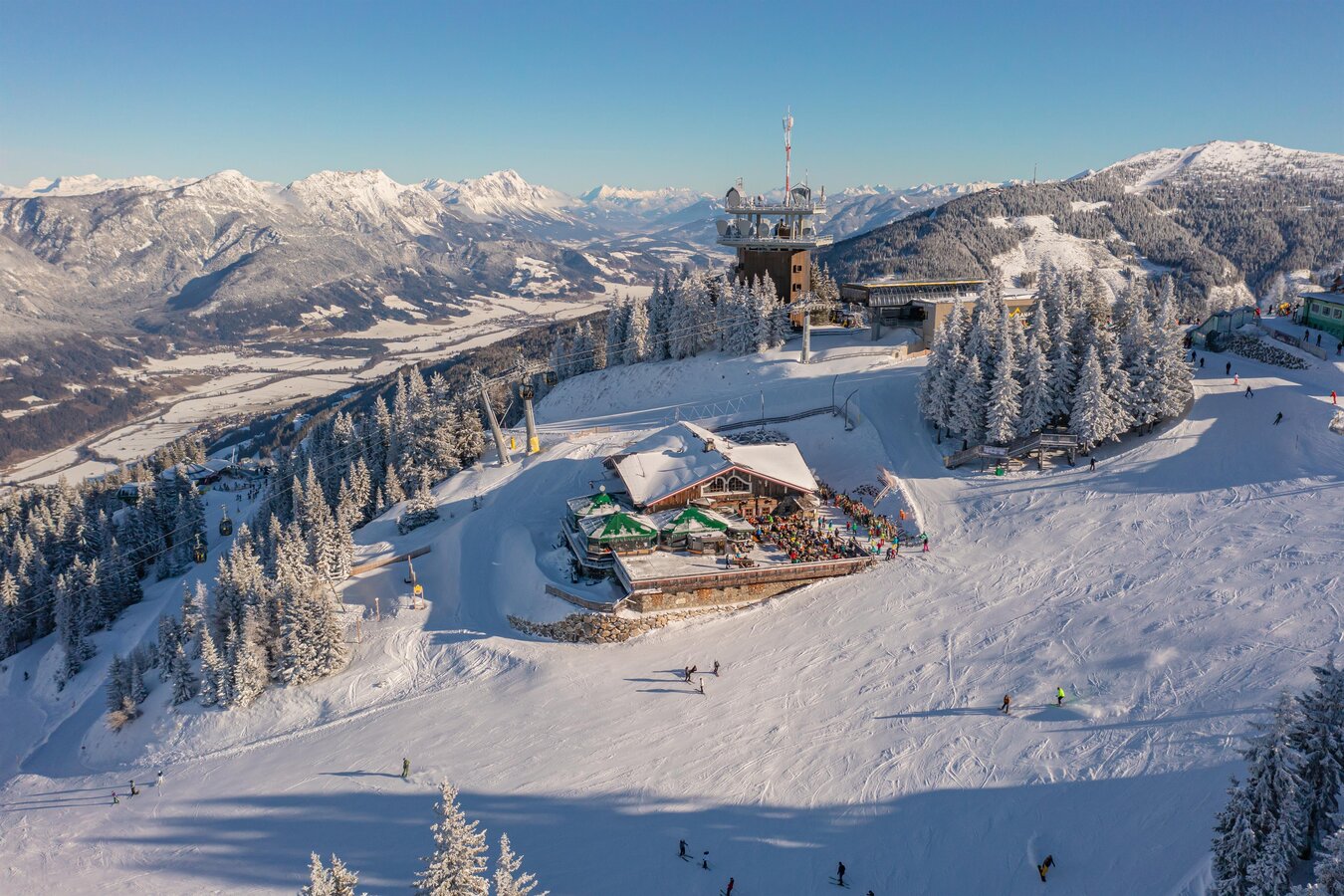 Die einzigartige Panoramaterrasse auf 1.800m Seehöhe, mit Blick auf das imposante Dachsteinmassiv, sorgt für Augenschmaus pur. Unser Schafalm Kinderkletterpark und das Hopsiland auf der Planai bieten unzählige Möglichkeiten für Kinder, sich auszutoben und neues zu entdecken.