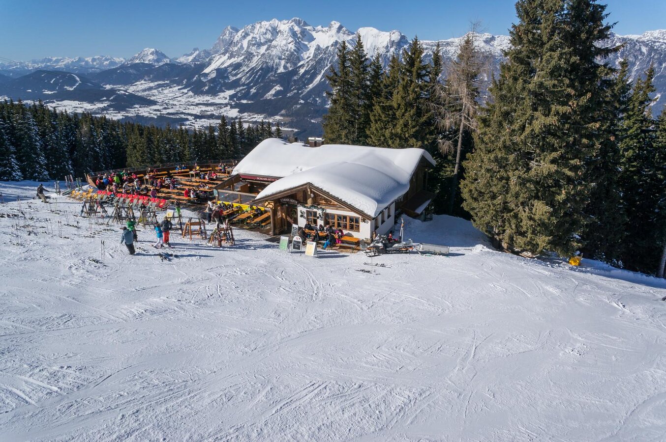 Inmitten der "Weltcup-Abfahrt" liegt die Schoarlhütte. Sie bietet einen traumhaften Blick auf das Dachsteinmassiv und gehört zu den AlmSkihütten am Hauser Kaibling.