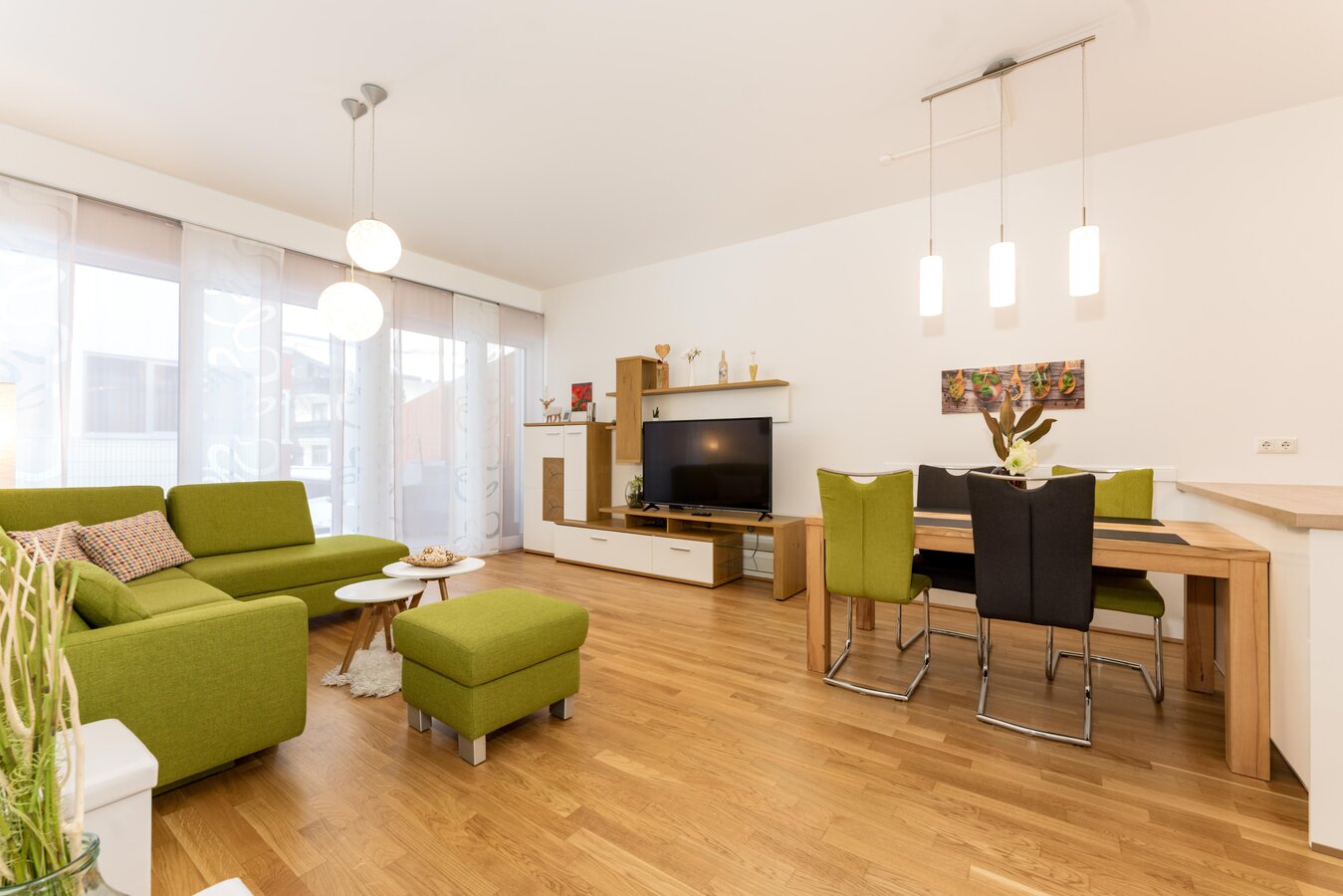 Top 6: 57 m² App. im 1. Obergeschoss für 2-4 Personen, hochwertige, voll ausgestattete Wohnküche mit Esstisch, Schlafsofa für 2 Personen und TV, 9 m² Balkon mit Balkonmöbel, ein separates Schlafzimmer mit Doppelbett und TV, ein Badezimmer mit Doppelwaschtisch, Dusche, eine separate Toilette, 1x Tiefgaragenparkplatz.