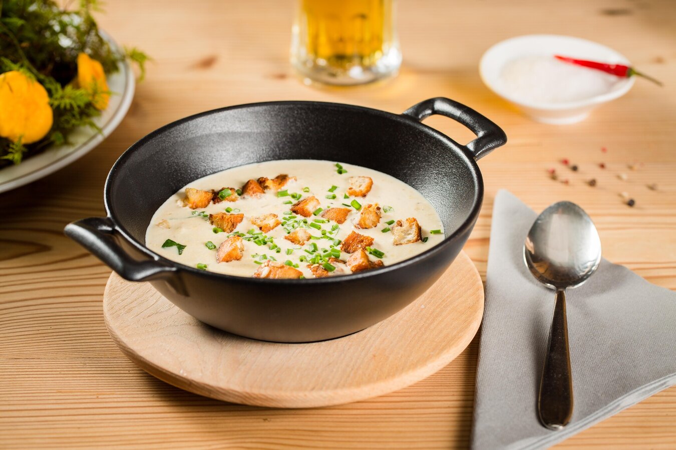 Mit der großen Sonnenterrasse bietet sie einen herrlichen Blick auf das majestätische Dachsteinmassiv – ideal, um bei Sonnenschein die Bergwelt zu genießen und bei einer zünftigen Einkehr zur Ruhe zu kommen. Die Küche setzt auf regionale Zutaten und frische Zubereitung: Klassiker wie Kaiserschmarrn, Käsespätzle, Brettljause oder auch moderne Interpretationen wie Kürbisrahmpasta mit Bergkäse und Walnüssen finden sich auf der Speisekarte. Unterstrichen wird das Ganze durch die Aussage: „Unser Essen ist regional und wird immer frisch zubereitet.“