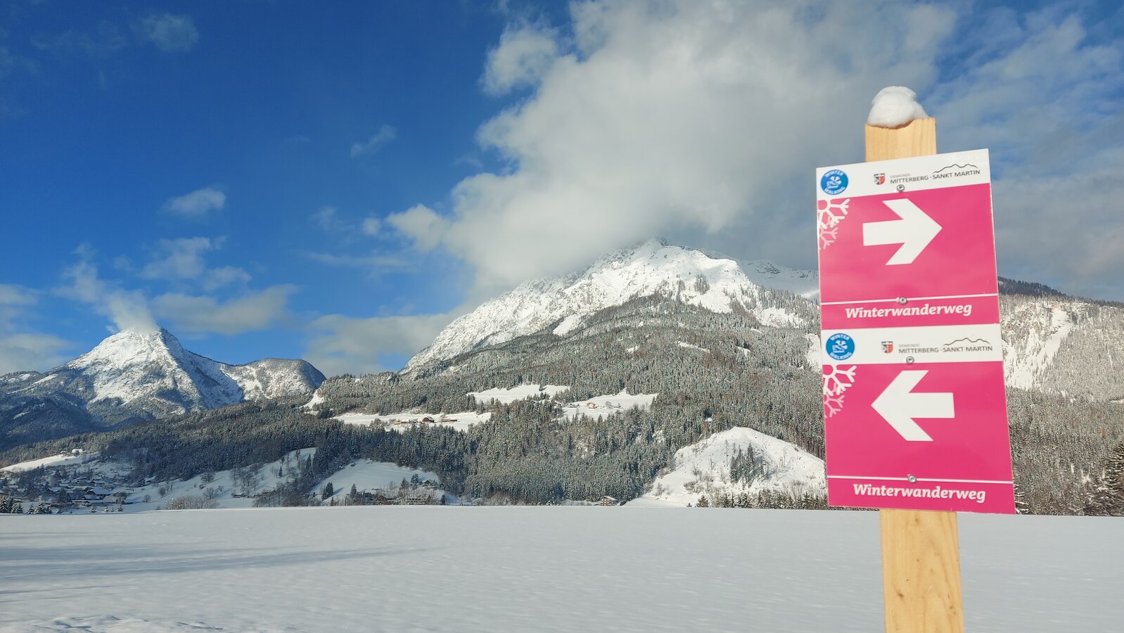 Die gelbe Wanderwegbeschilderung ist grundsätzlich nur im Sommer bzw. in der schneefreien Zeit gültig. Ausnahmen sind Richtungstafeln mit dem Icon »Winter Walking«. Andernfalls verfügen Winterwege über eine eigene - in den meisten Fällen magentafarbene - Beschilderung.