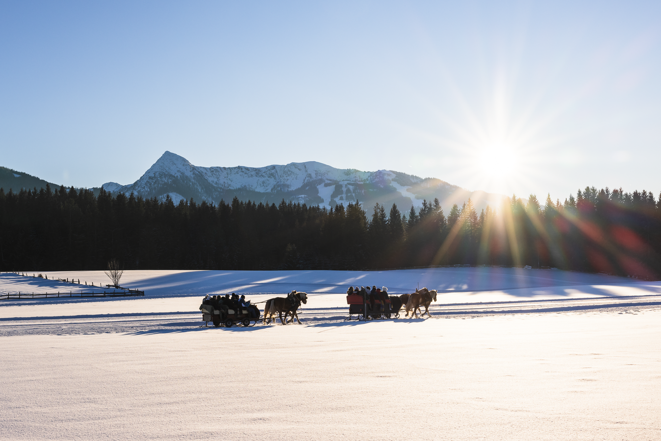 Eine Pferdeschlittenfahrt durch die verschneite Landschaft von Schladming-Dachstein ist ein besonders stimmungsvolles Wintererlebnis. Warm eingehüllt gleitest du durch stille Wälder und offene Täler mit Blick auf das Dachsteinmassiv. Ob tagsüber oder abends bei Laternenlicht – diese gemütliche Auszeit sorgt für entschleunigte Wintermomente abseits der Piste.