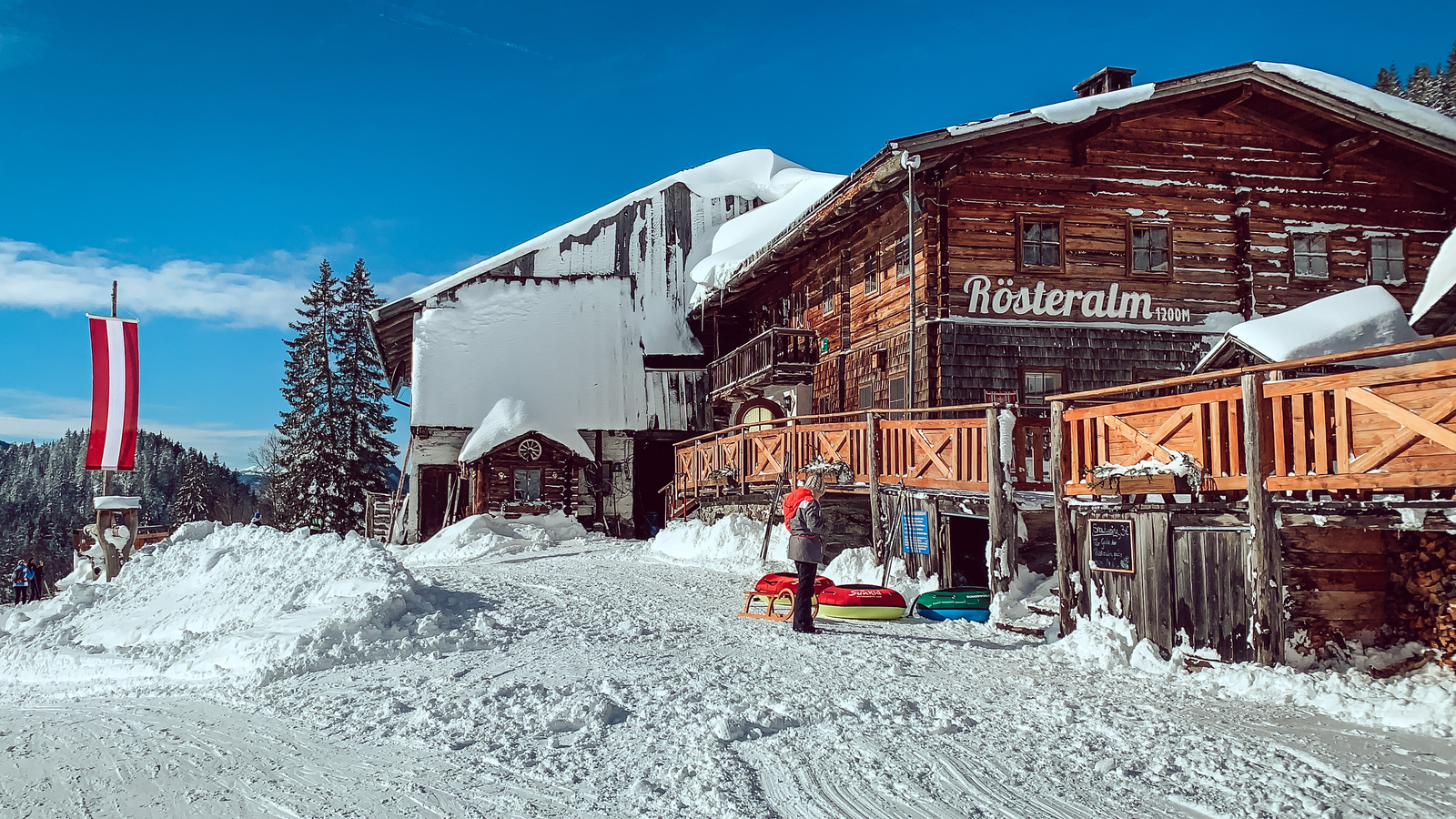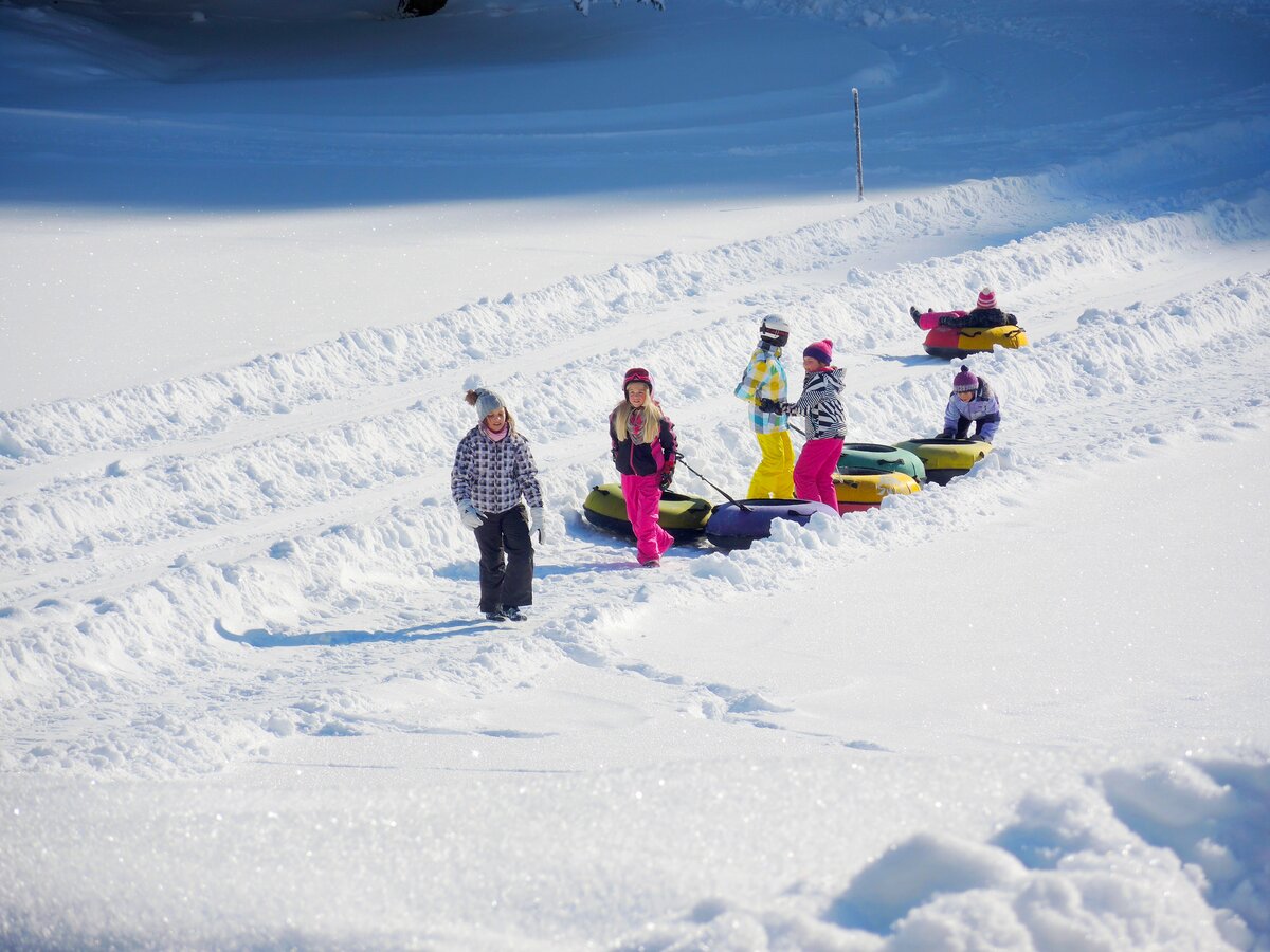 Genauso lange wie die Jausenstation, gibt es auch schon das Snowtubing auf der Rösteralm - ein besonderes Highlight bei jedem Besuch. Früher wurde noch mit alten Traktorreifen gerutscht, heute sausen Gäste in den bunten Reifen auf drei speziell präparierten Bahnen den Hang hinunter. Hast du das schon einmal ausprobiert?