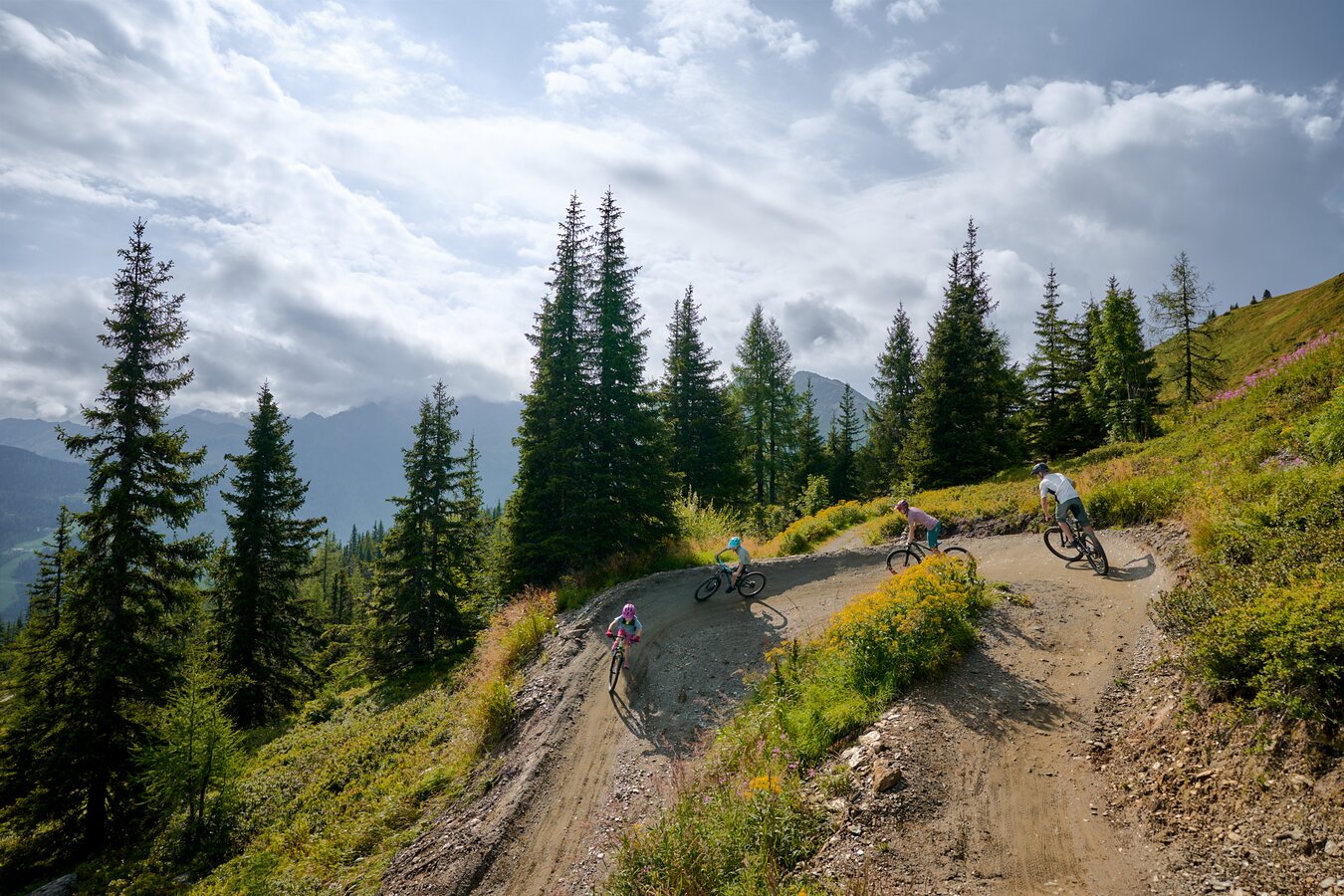 Die Flowline bietet in dieser Bikesaison noch mehr Fahrspaß: Die Strecke wurde verlängert und führt nun auf einer Länge von rund 16 Kilometern vom Berg bis ins Tal. Der breit angelegte Trail überzeugt mit sanftem Gefälle und zahllosen Wellen - ideal für Familien, Anfänger und Profis. Große Anliegerkurven sorgen für eine geschmeidige Fahrt, während das atemberaubende Panorama ein unvergessliches Erlebnis garantiert. Ob Bikepark-Neuling oder gezieltes Techniktraining – die Flowline vereint Fahrspaß, Naturerlebnis und echtes Bikepark-Feeling in perfekter Harmonie.