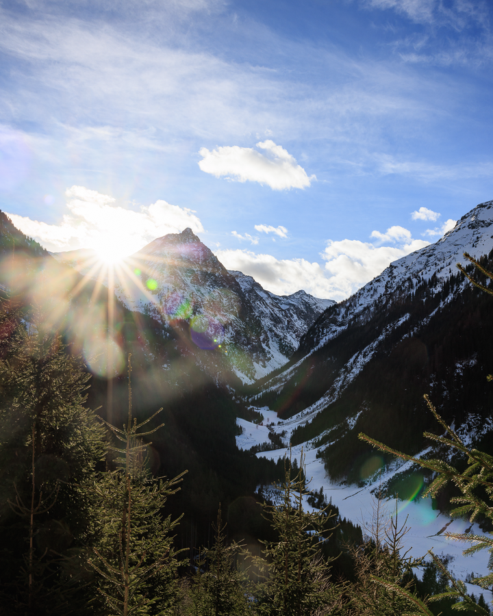 30.12.2023, Schladming, Steiermark, Österreich (Austria): Winter-Sonnenaufgang im Steinriesental, hinteres Untertal bei Schladming. Der rechts von der Sonne aufragende Gipfel ist der Rauhenberg.