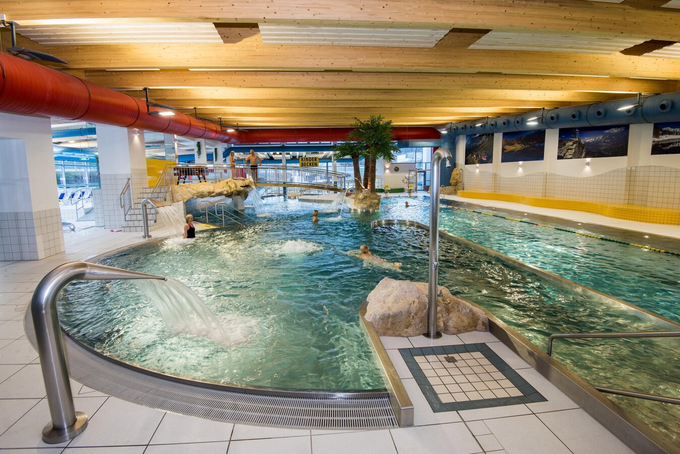 Größere Kinder zieht es schon eher zu den Rutschen, wo sie dutzende Male den 66 m Rutschkanal hinuntersausen. Aber auch Strömungskanal, Wasserfall und Luftstrudel sorgen für Spaß und Entspannung bei den Kindern. Das Kinderbecken mit Minirutsche und unterhaltsamen Spritzdüsen sorgt für eine Planscherei ohne Ende. Kein Wunder - denn die Wassertemperatur beträgt unter der Woche angenehme 28°C, am Samstag und Sonntag sogar 32 °C.