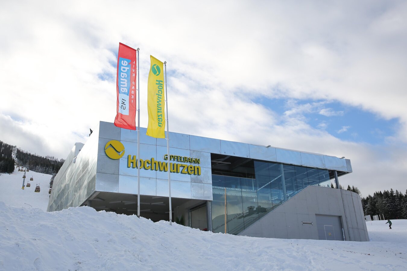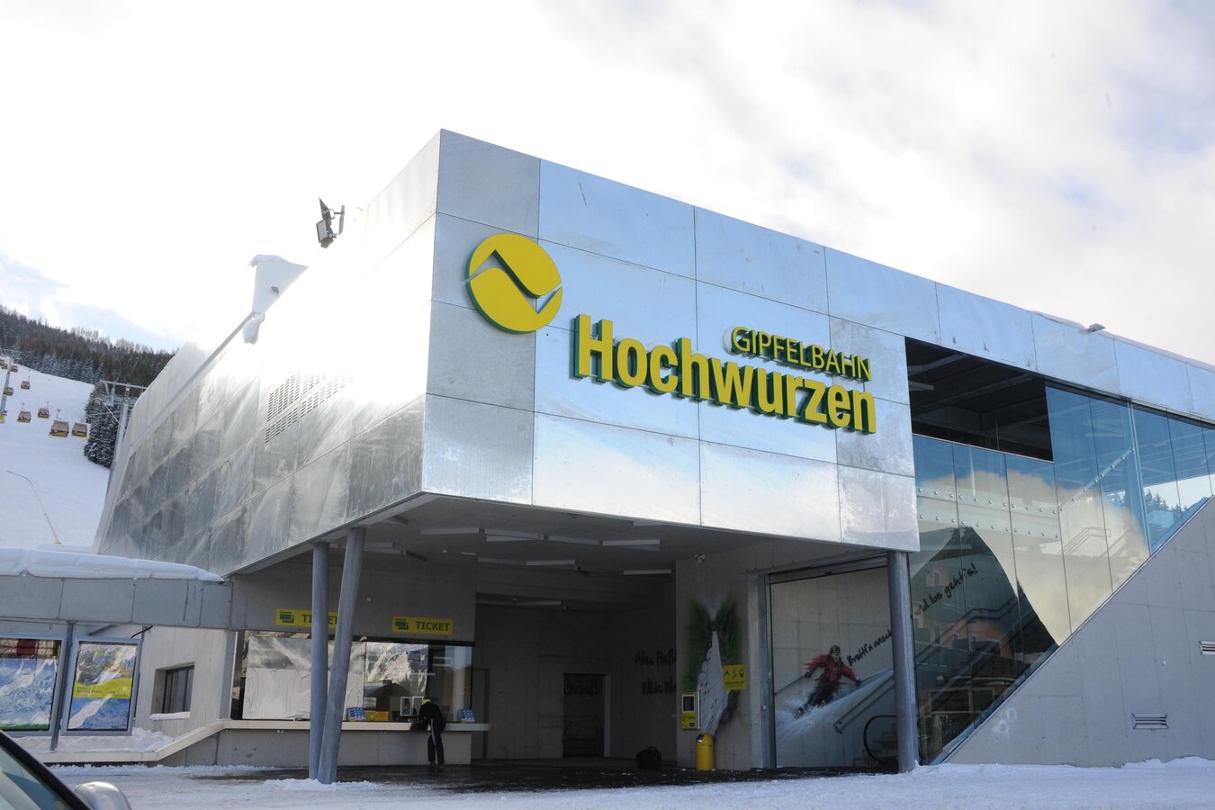 Die Talstation der Hochwurzen Gipfelbahn besticht nicht nur durch modernes und schlichtes Design, auch die Ausstattung verspricht einen angenehmen und entspannten Start in den Skitag. Großzügige Parkflächen, Ruhezonen, ein Sportgeschäft in unmittelbarer Nähe, Ski- und Rodelverleih – hier findest du alles für deinen perfekten Wintertag. Die Air-Brush Kunstwerke von Knud Tiroch werden dir schon zu Beginn deines Ski-Tages ein Lächeln ins Gesicht zaubern.