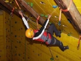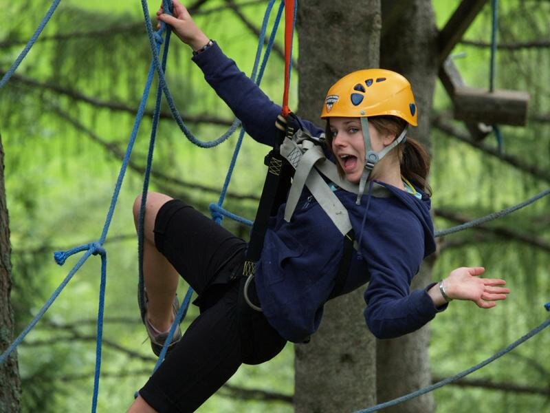 with rope, seat belt, helmet, nice jumps, swimming passages, slides and cable cars