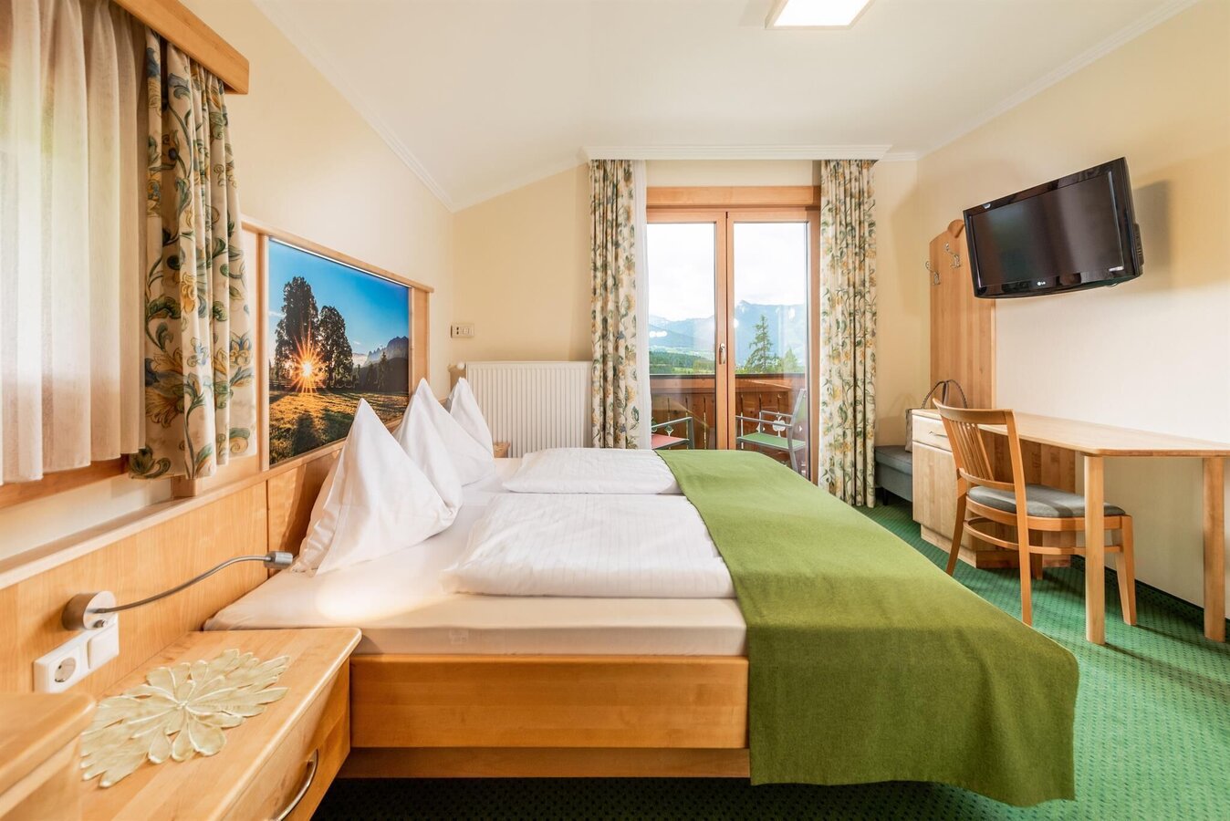 The Aparthotel Ramsau, your holiday destination at the foot of the Dachstein with its picturesque location on the slope at the edge of the forest, is the ideal starting point for your stay in Ramsau am Dachstein. Enjoy the fantastic views from our hotel to the Schladming Tauern and to the centre of Ramsau am Dachstein with the WCS ski-jump. Our Hotel Pension Eberlehnerhof is only a 15 minutes’ walk away from the Ramsau Ort centre. The bus stop of the public buses that take you to the Dachstein glacier, the Rittisberg or to Schladming, where you can access the interlinked ski resorts, can easily be reached within 10 minutes by foot. Take a break and stroll along the gentle, sunny paths through forests and fields. In summer, you might take advantage of one of the guided hikes to the most beautiful spots of the region, which are offered twice a week. All our en-suite rooms - 2 double rooms, 4 Appartements 65 m2, 45 m2, 35 m2 - are equipped with bright furniture, shower and WC, hair dryer, flat screen with SAT-TV and Sky. Moreover, there is free of charge WLAN. Wake up gently with the morning sun, open the balcony door and breathe in the fresh mountain air. Your day starts with a perfect breakfast. Choose from the great variety of our buffet breakfast including a selection of fresh fruit and bread rolls, all sorts of mueslis and cereals, tea or coffee. In summer, we invite you to a coffee-and-cake-afternoon as well as a barbecue evening once a week. After a beautiful and exciting day out, you are welcome to relax body and soul in our wonderful well-being area featuring a Finnish sauna, an organic steam sauna, an infrared warm-up cabin, and a panorama relaxation room with a panoramic view to the impressive Lower Tauern mountains and to Ramsau Ort. There is sufficient parking space in front of our hotel free of charge. Your sports equipment is safe in our spacious ski and wax room. The family friendly holiday resort Ramsau am Dachstein offers romantic snowshoeing or winter walking paths, ski runs and ski lifts for beginners, perfectly groomed cross-country trails, all of which contributes to a varied winter holiday. The floodlit night toboggan run on the Rittisberg attracts with fun for big and small in the evening. On an altitude from 1100 m to 2700 m at the foot of the Dachstein, you are offered a multitude of leisure and sports activities: walking through the Alpine pastures, hiking the numerous mountain tops, climbing and mountaineering along the via ferratas and secured climbing paths, or Nordic walking along the Panorama alley. Enjoy your stay in our Aparthotel Ramsau on the sunny plateau of Ramsau am Dachstein. Your hosts, Steiner/ Bachler family