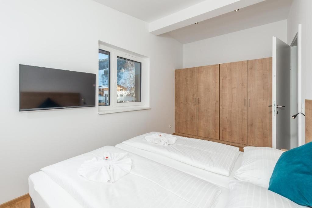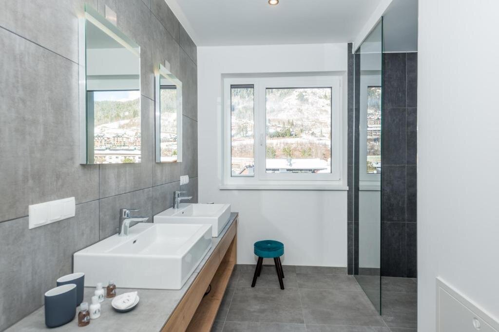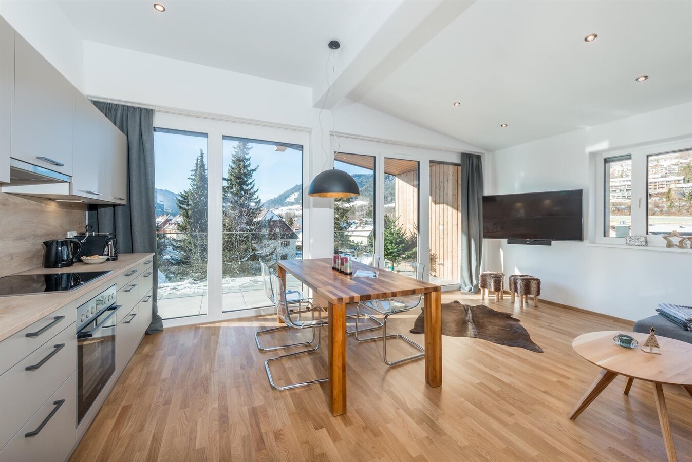 Haus BERGLUST - Apartment Dachstein: 70 m² open, feel-good living space with panoramic glazing and comfortable pull-out sofa, flat screen TV and large dining table, invite you to relax and enjoy yourself. Fully equipped open designer kitchen with high quality appliances. 2 bedrooms with box spring double beds and flat screen TV. 13 m² sun-drenched roof terrace with a unique view of Schladming, the beautiful Untertal and the Hochwurzen offer that pure holiday feeling. Luxurious bathroom with walk-in shower and double washbasin. You can easily reach all of this via a modern elevator. Parking lot directly at the house, ski room.