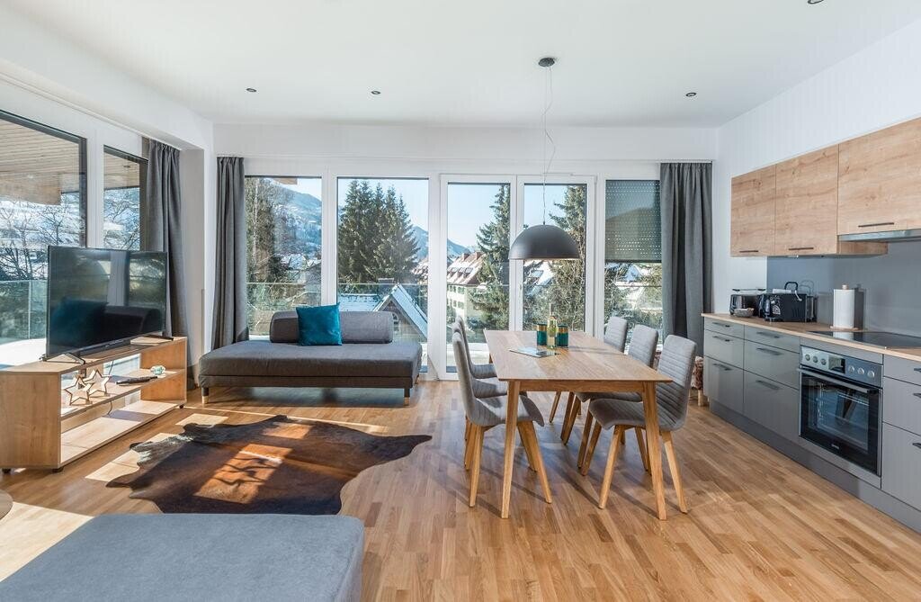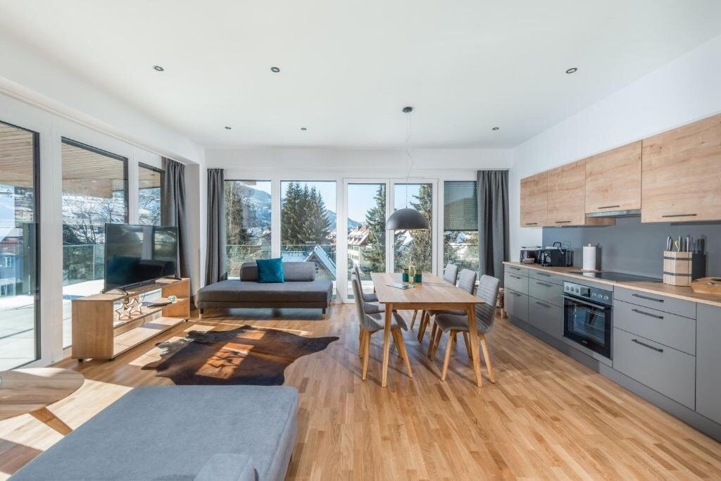 Haus BERGLUST - Apartment Planai: 85 m² open, feel-good living space with panoramic glazing and comfortable pull-out sofa, flat screen TV and large dining table invite you to relax and enjoy yourself. Fully equipped open designer kitchen with high quality appliances. 2 bedrooms with box spring double beds and flat screen TV. 45m ² sun-drenched roof terrace with a unique view of the Planai target slope, the beautiful Untertal and the Hochwurzen offer pure holiday feeling. Luxurious bathroom with walk-in shower. You can easily reach all of this via a modern elevator. Parking lot directly at the house, ski room.