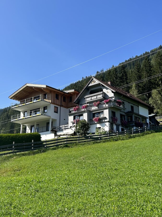 Our house is situated in a quiet and sunny location on the edge of the forest and is a detached grey wooden house with a new extension of the same size.