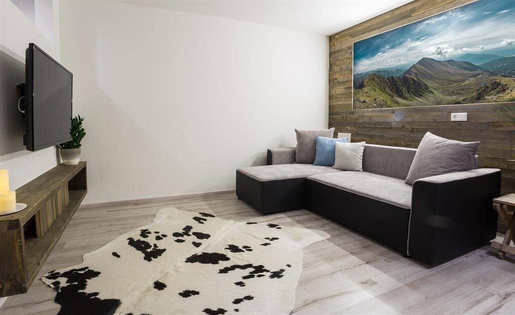 The approx. 55m² flat has a dining area and a sofa bed with a flat-screen cable TV, a terrace with mountain views and a large bedroom with a double bed. The kitchen includes a dishwasher and an oven. There is also a fridge, hob, coffee machine and kettle. The private bathroom has a shower and a separate WC.
