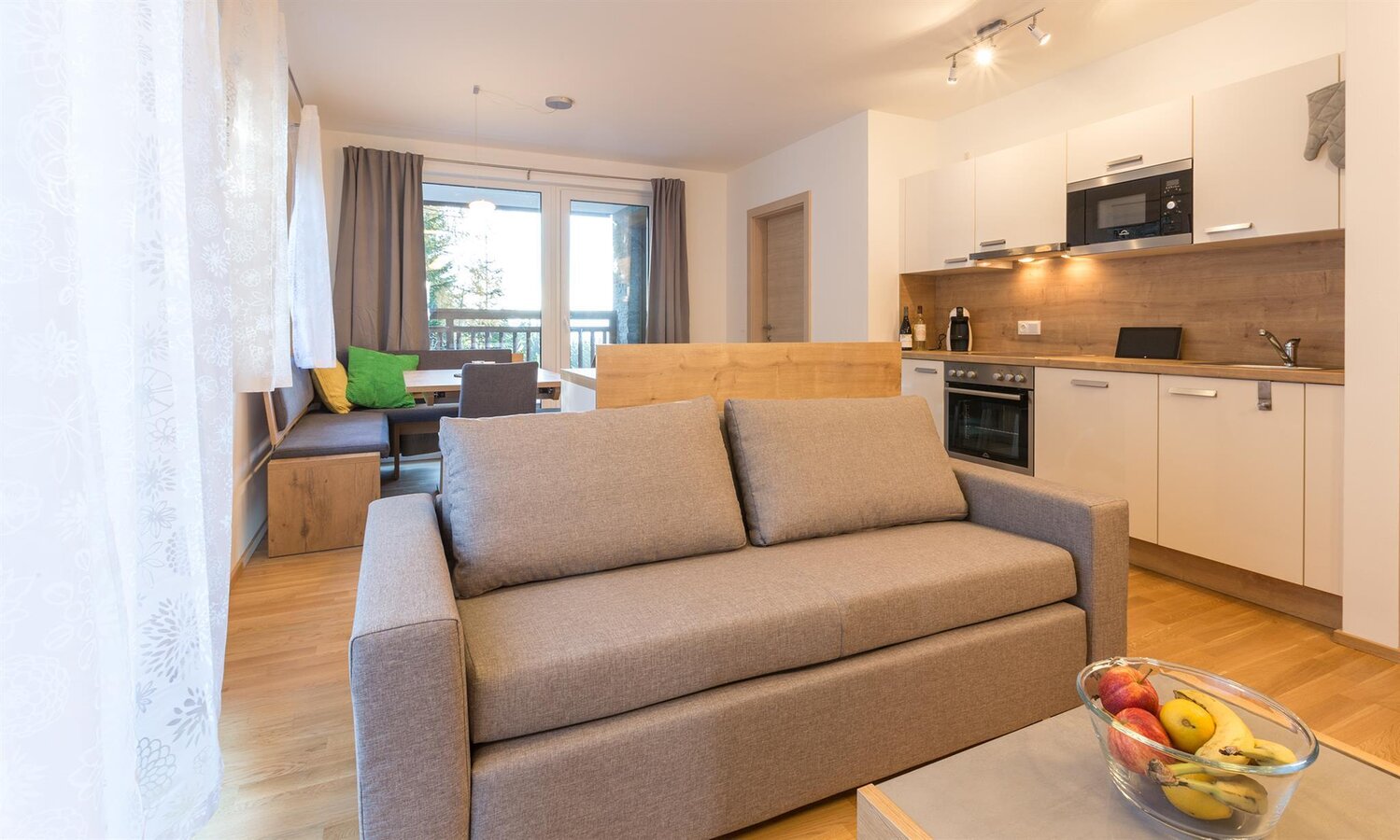 Start your day with a wonderful panoramic view of the impressive mountain landscape of the Dachstein. Whether in summer or winter. Just breathtaking. The perfect starting point for skiers or hikers.