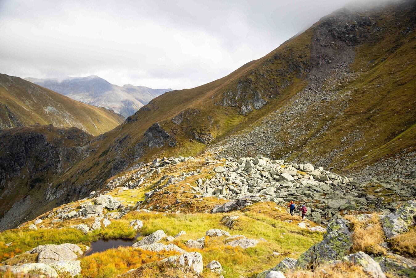 From the Breitlahnhütte we follow path no. 702 in direction Schwarzensee. Before we reach this lake, we turn left in the area of the Grafenalm. This path takes us past the “vordere Neualm” and the “innere Neualm”. At the wayside cross we turn right and hike steeply uphill to the Rantentörl. Above the Rantensee we cross the narrow path through the meadows of the Rantenalm to a small, crystal clear but nameless lake. Then it goes on across the Hinterkarscharte through and over boulders at the foot of Speikleiten to the Hubenbauertörl.