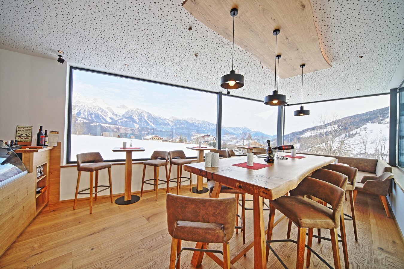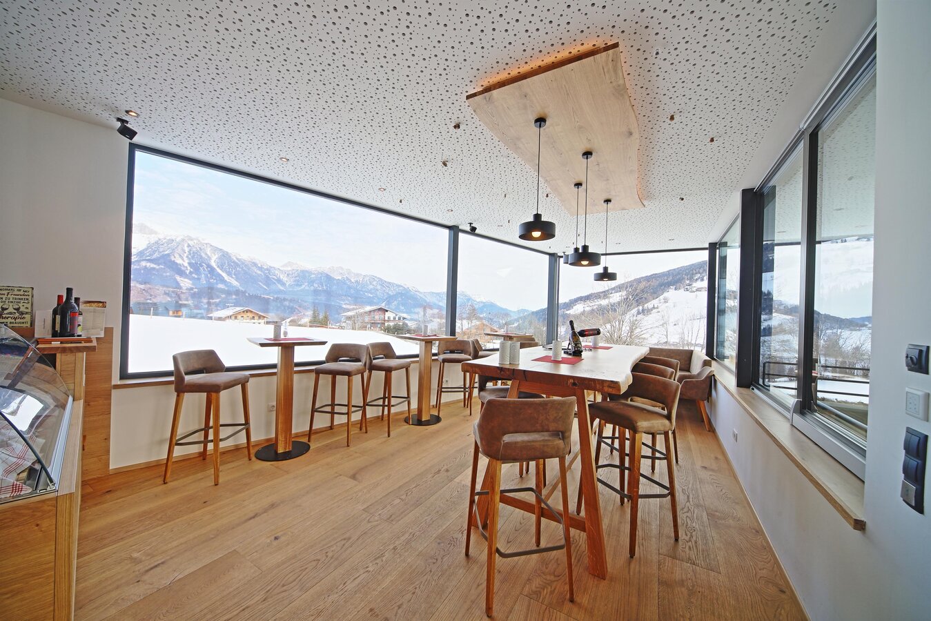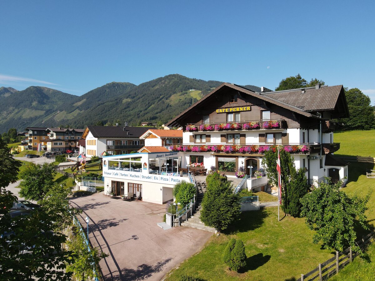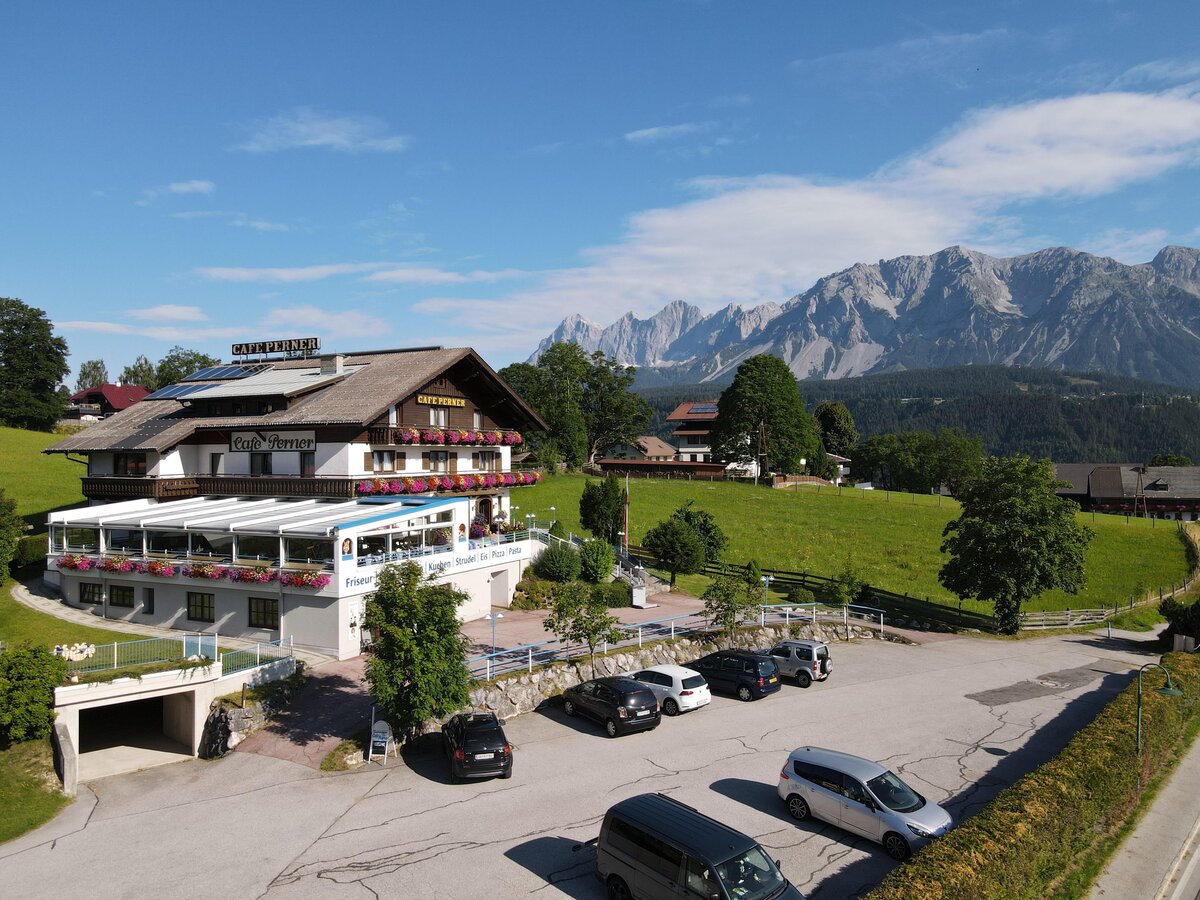 Our small family-run hotel, located in a quiet, central spot on the sunny high plateau of Rohrmoos, offers you: rooms with 4-star comfort, a nice day and evening bar, a large sun terrace, an adventure playground for children, sauna, solarium and billiard room, seminar room, underground garage. For your culinary delight, we provide a rich breakfast buffet and our long-renowned cakes, pastries, strudels, and ice specialties in our café. From 3 PM to 9 PM, we serve homemade pizzas, pasta, and salads.