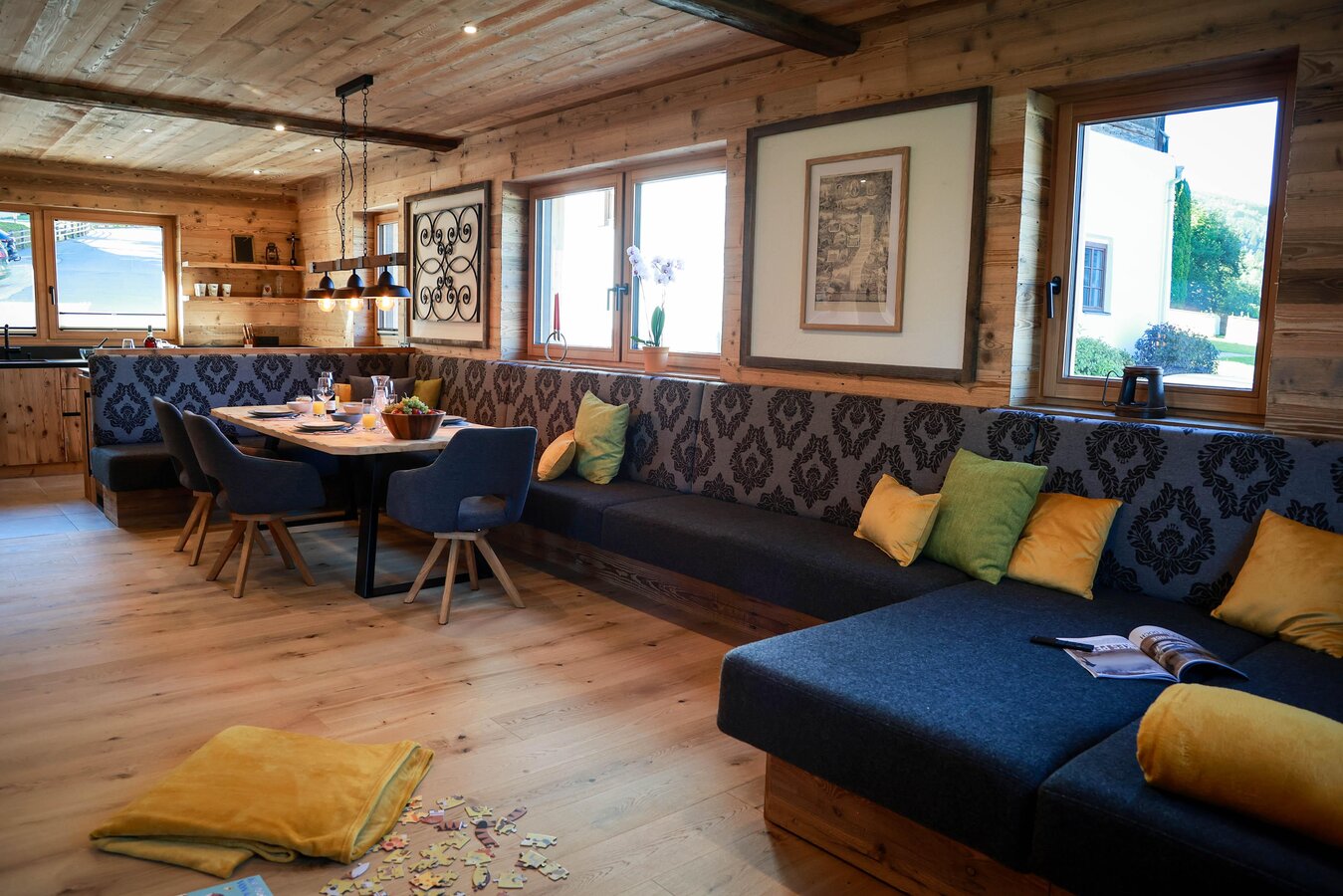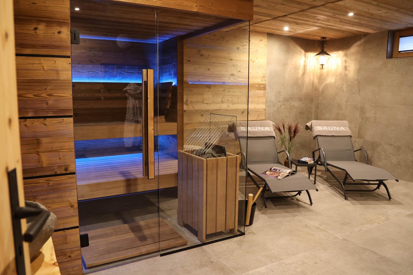 The living room with a cozy Swedish stove invites you to relax – perfect for ending the day by the crackling fire with a glass of wine. After an active day on the slopes or a hike, you can wonderfully regenerate and recharge in the large sauna with relaxation area and shower.