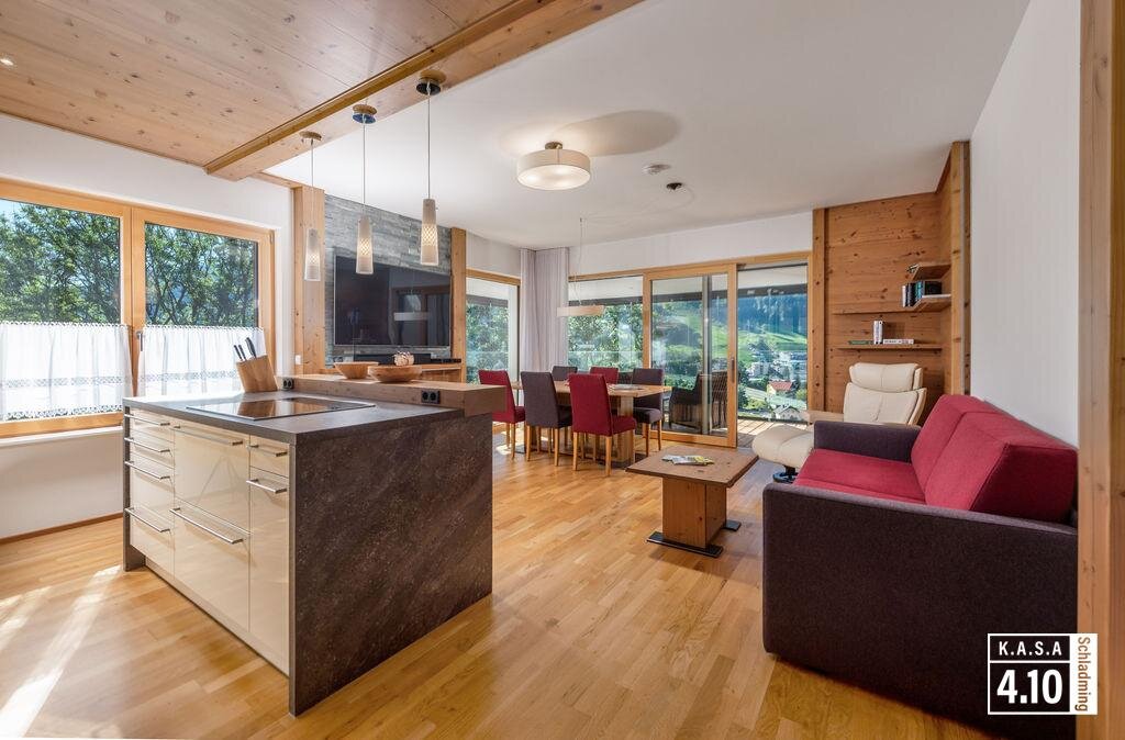 The apartment KASA 4.10 is situated in a quiet and sunny panoramic location, 15 min from the centre of Schladming, 20 min from the railway station, directly on the walking, cycling and hiking trail network. Car-free holidays guaranteed. Access to the 4-mountain Schladming ski area or the cross-country skiing eldorado of Ramsau am Dachstein is easily possible by ski bus. The bus stop is in the immediate vicinity. Restaurants, supermarkets and centre shops are within walking distance.