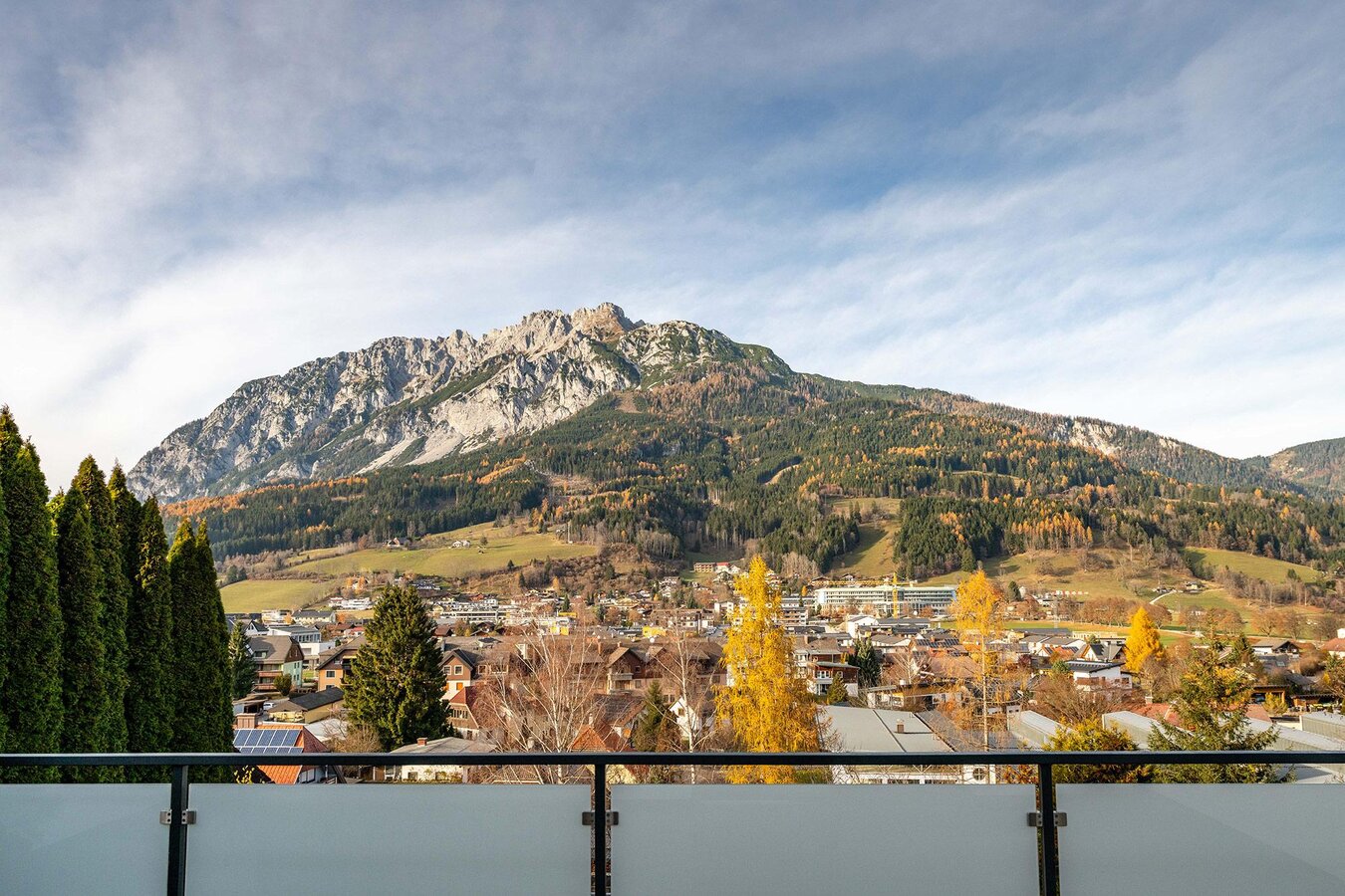 A special highlight is the spacious terrace, from which you can enjoy an impressive view over Gröbming and the surrounding mountain peaks: Stoderzinken, Kammspitze, and Grimming.