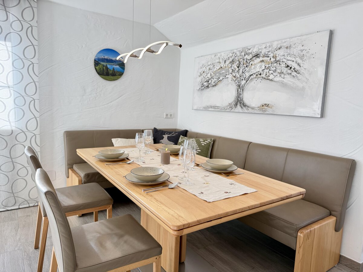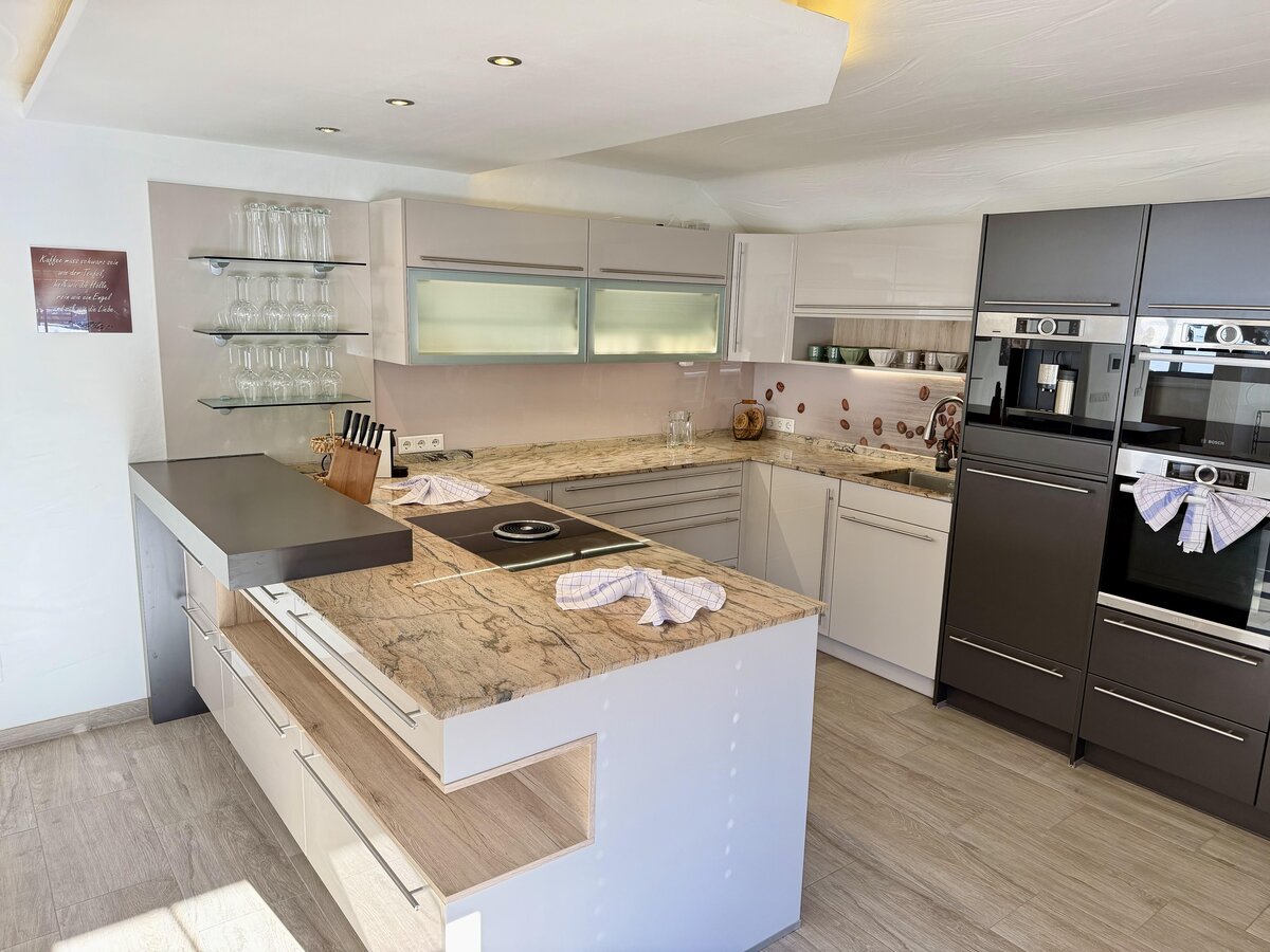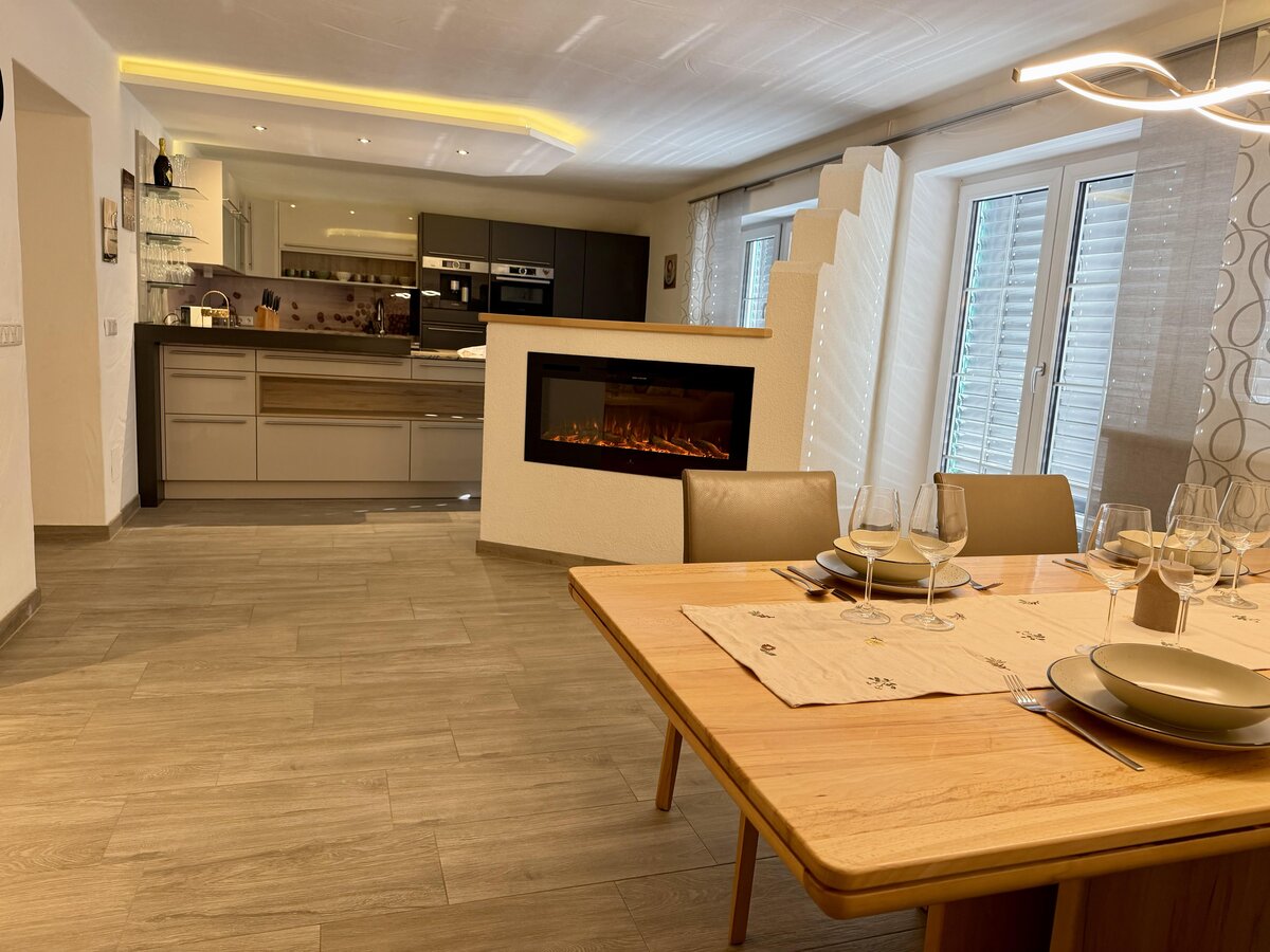 The accommodation features a terrace, a washing machine, an iron and ironing board, Wi-Fi, a balcony, central heating, two outdoor parking spaces on the property, a television, and satellite TV. The open-plan kitchen with an induction hob is equipped with a refrigerator, microwave, oven, freezer, dishwasher, dishes and cutlery, cooking utensils, a coffee machine, a kettle, and a juicer.