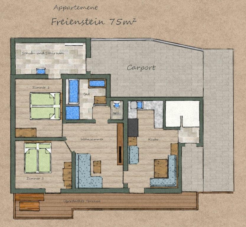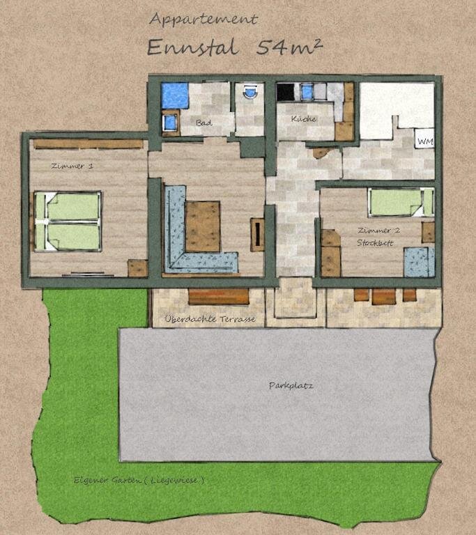 In the apartment "Ennstal" a covered terrace with access to the private garden or lawn invites you to relax in the summer or for barbecues (grill is available free of charge). The apartment "Freienstein" has a balcony with a small covered terrace. Furthermore, this apartment offers a carport for your car.