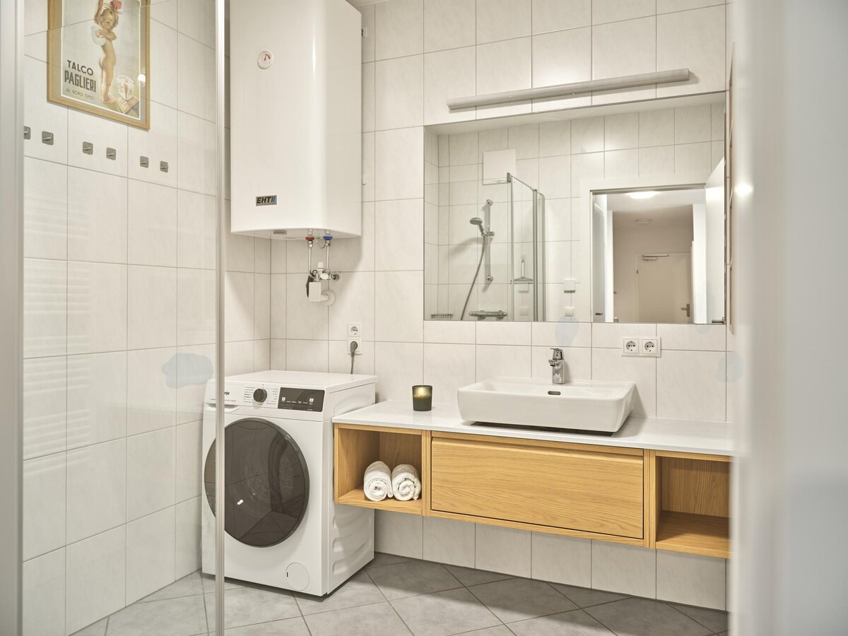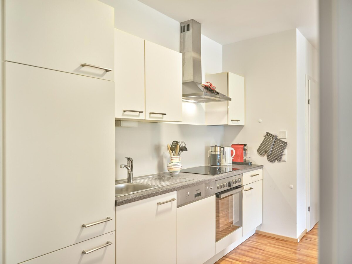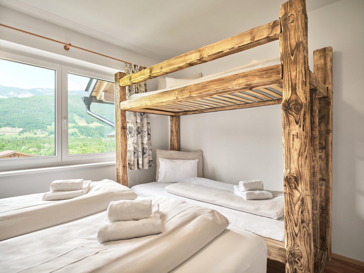 The apartment has 2 bedrooms, each with a double bed, and one of the bedrooms also has a bunk bed. You can prepare meals together in the fully equipped kitchen.