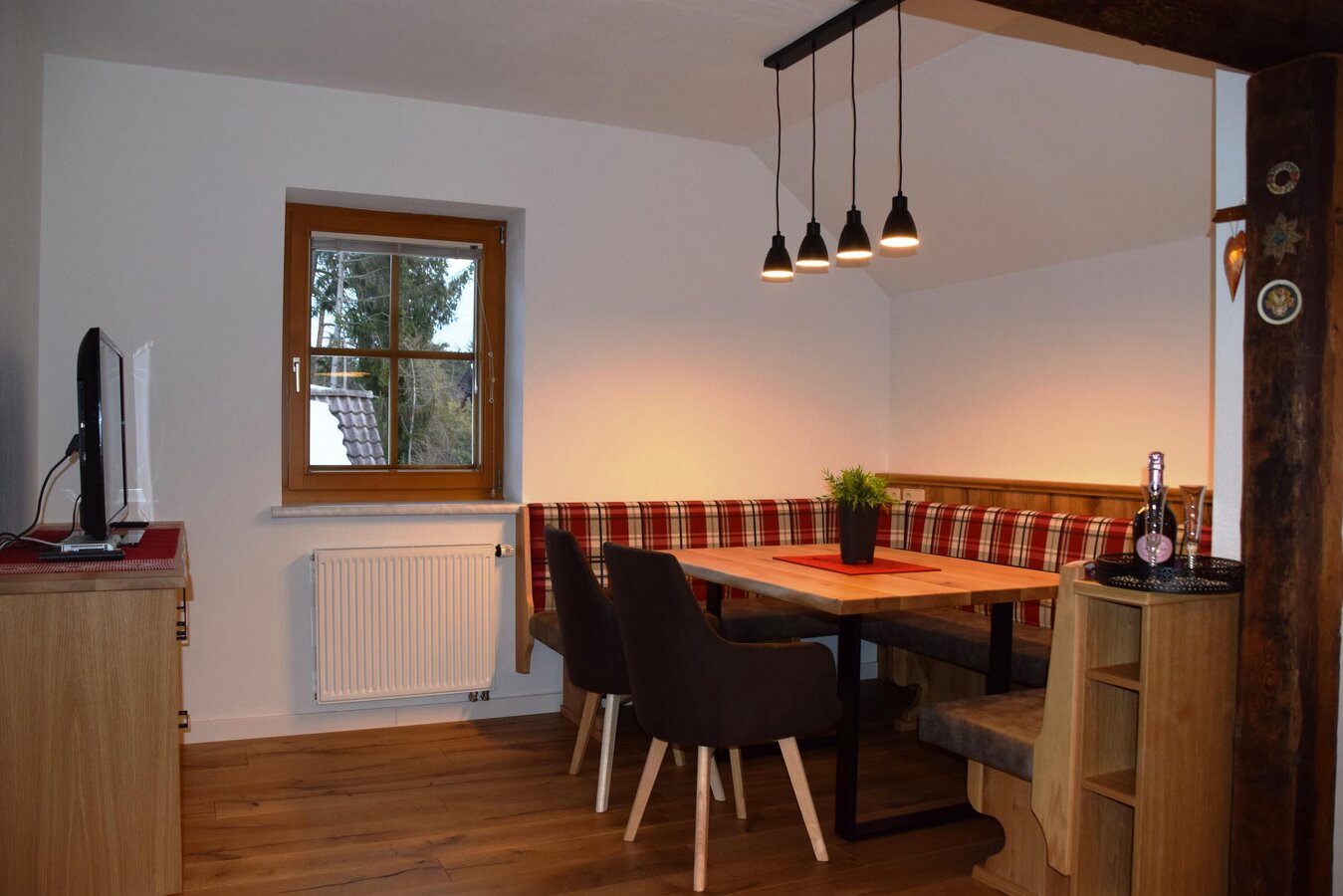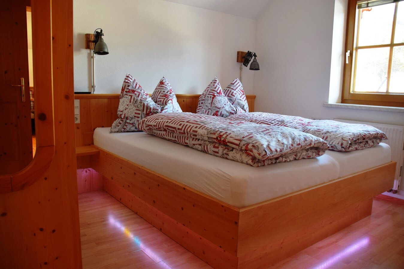 Our flat offers 90 m² of space for 4 to 8 people. The flat has 2 double rooms and a four-bed room with a double bed and a bunk bed (especially popular with smaller children). Each room has its own bathroom with shower, WC and balcony. The fully equipped kitchen with cosy dining and seating area invites you to linger. Free W-Lan, ski storage room with boot dryer, satellite TV and sufficient parking spaces are a matter of course.