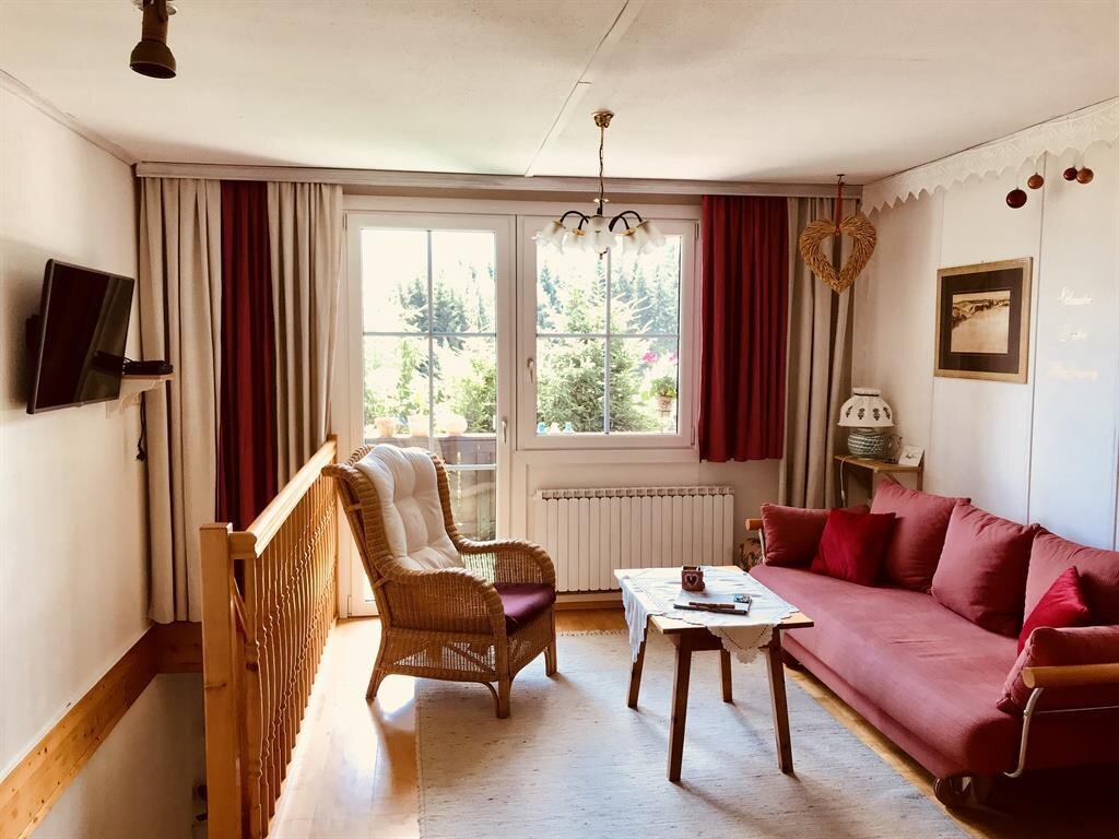 The Fichtenwald house is sunny and quiet at the edge of the forest in the district of Untere Leiten, traffic control system number Violet 248 in Ramsau. The apartment is rustic furnished. Living room with pull-out couch and kitchenette. Bedroom with shower, satellite TV, radio, bathroom, bed, table, and towels in the house. South-facing balcony, a total of 55m² of coziness. Pets allowed. You are warmly welcome here!