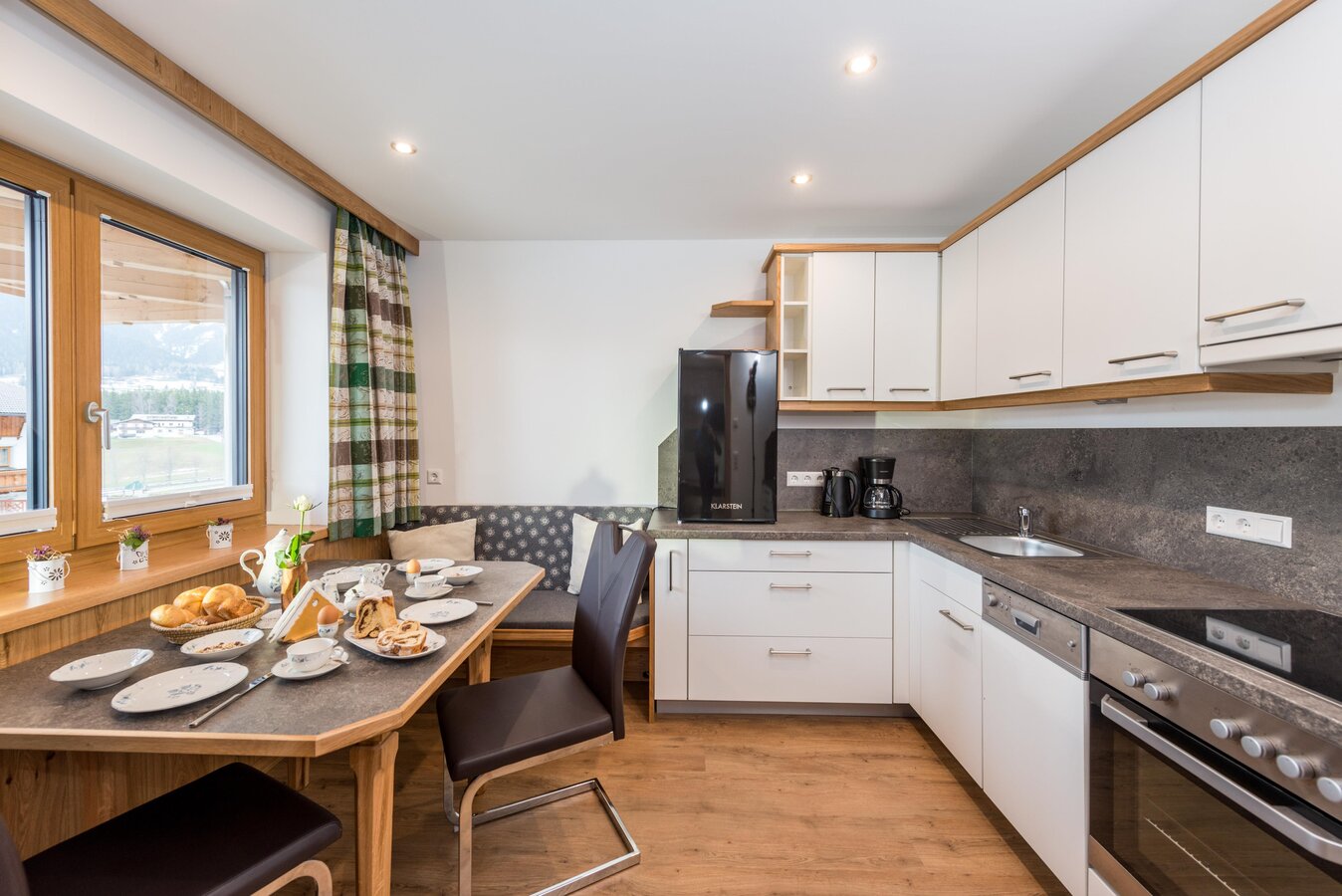 Early risers or late sleepers enjoy a magnificent view of the Dachstein massif at the breakfast table in the apartment. Our baker delivers fresh bread every day, and we hang a selected "bread bag" on the door. Alternatively, we are happy to sweeten your start to the day with a breakfast buffet at Landhaus Kirchgasser.