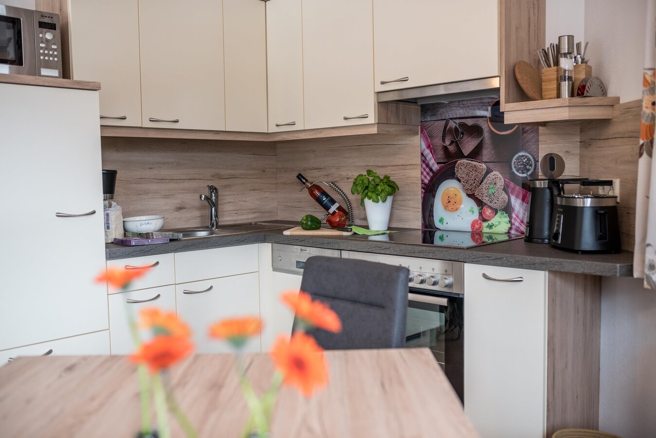 Want to surprise your loved one with your own cooking skills? Dinner for two on the balcony? The generously equipped kitchens turn every hot dog boiler into a gourmet chef! If the kitchen can't manage, we spoil all connoisseurs at Landhaus Kirchgasser with a 4-course dinner menu.