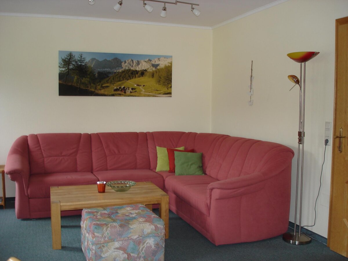 We offer one ample 65 m² holiday flat furnished with attention to detail accommodating two-to-five people. The holiday apartment has two bedrooms with views of the Dachstein, a bathroom with shower and a separate WC with windows, a fully equipped large kitchen-diner with a dish-washer, electric cooker, coffee maker, and a cosy dining corner. The bright comfortably designed living area invites to make yourself at home. Enjoy the wonderful panorama across the Schladming Tauern mountains from the south-facing balcony.