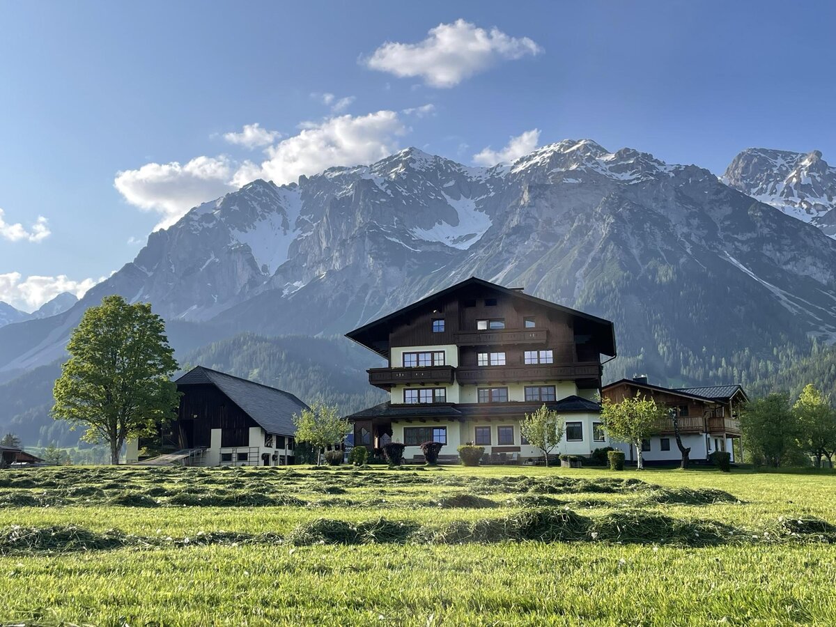 Located in Kulm, a part of Ramsau am Dachstein, our farm Bauernhof Pension Möslehnerhof is surrounded by lush green meadows and fields. Right on the doorstep you find walkways, hiking routes, Nordic walking paths, running trails, horseback riding tracks, and sleigh-riding. In winter, we are an ideal starting point for winter walking and cross-country skiing. Both cross-country trails and winter walking paths pass by or farm, and a local cross-country ski school with proper practice area is right beside our house. In five minutes by foot, you reach the information office, a bankomat, a hairdresser, a sports shop, a bakery, a newsagent, and bus stops.