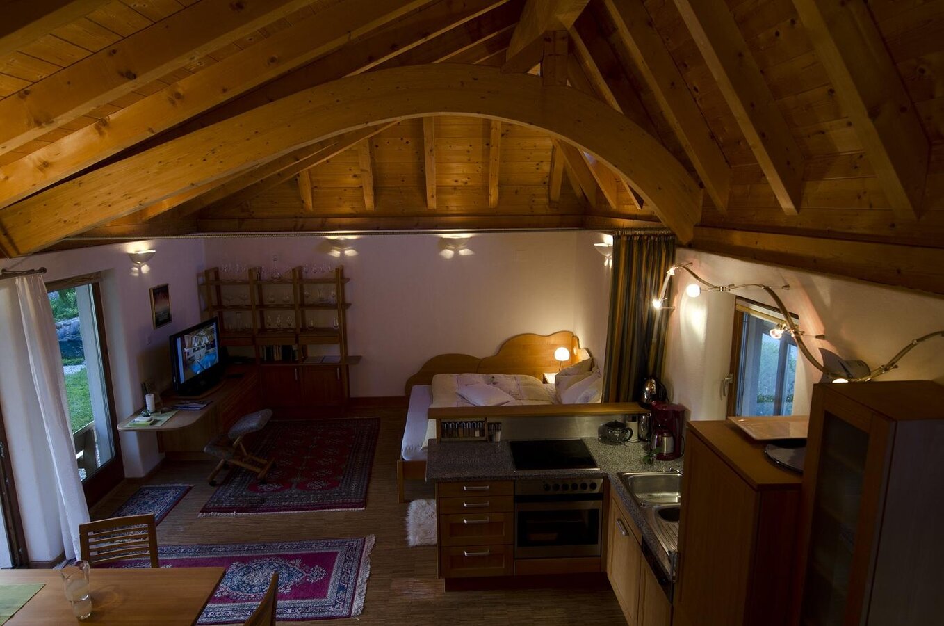 As you enter the house there is an entrance area (wind trap), and to the right stairs lead directly down to the activity room. Straight ahead you enter the studio which contains the sleeping area as well as the cooking and dining area. All furniture in the studio is made from solid wood, which gives it a cosy feel.
