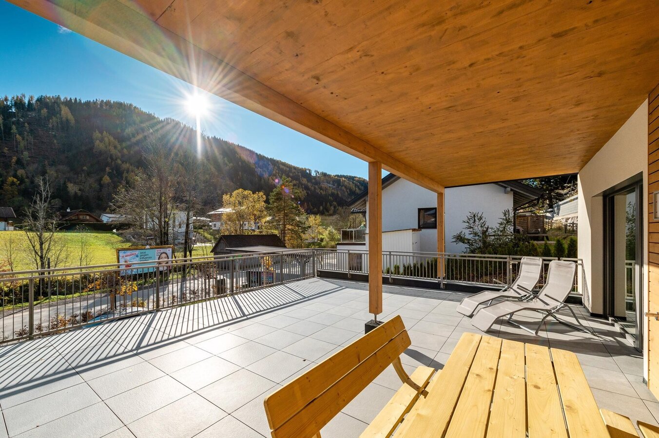 The large terrace is the perfect spot to enjoy the view of the surrounding mountainous landscape.